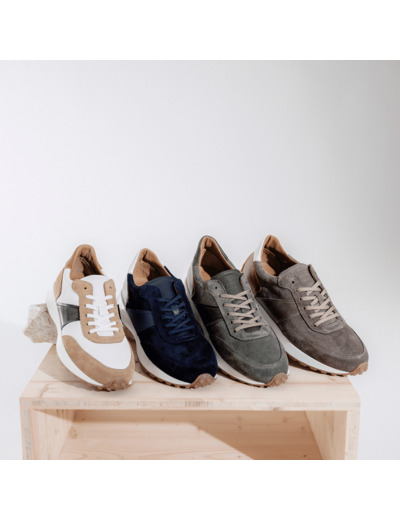 Sneakers pour homme Navy. Bi-matière cuir lisse et suédé. Montage soudé. Doublure intérieure cuir. Semelle gomme crantée.