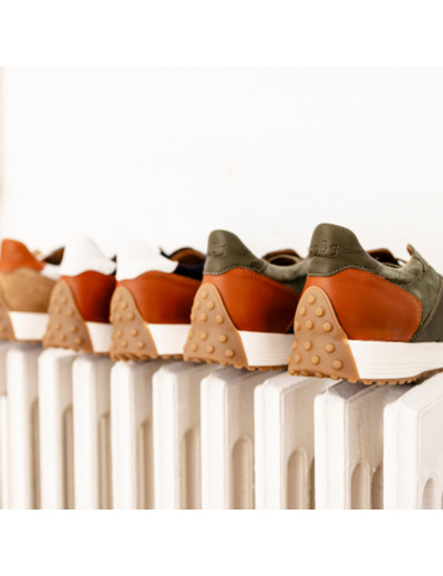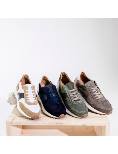 Sneakers pour homme Kaki. Bi-matière cuir lisse et suédé. Montage soudé. Doublure intérieure cuir. Semelle gomme crantée.