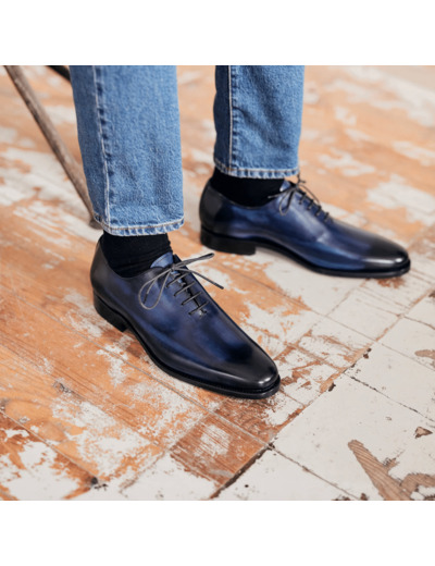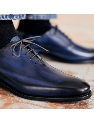 Richelieu "One Cut" pour Homme en cuir Bleu et semelle cuir. Montage cousu Goodyear.