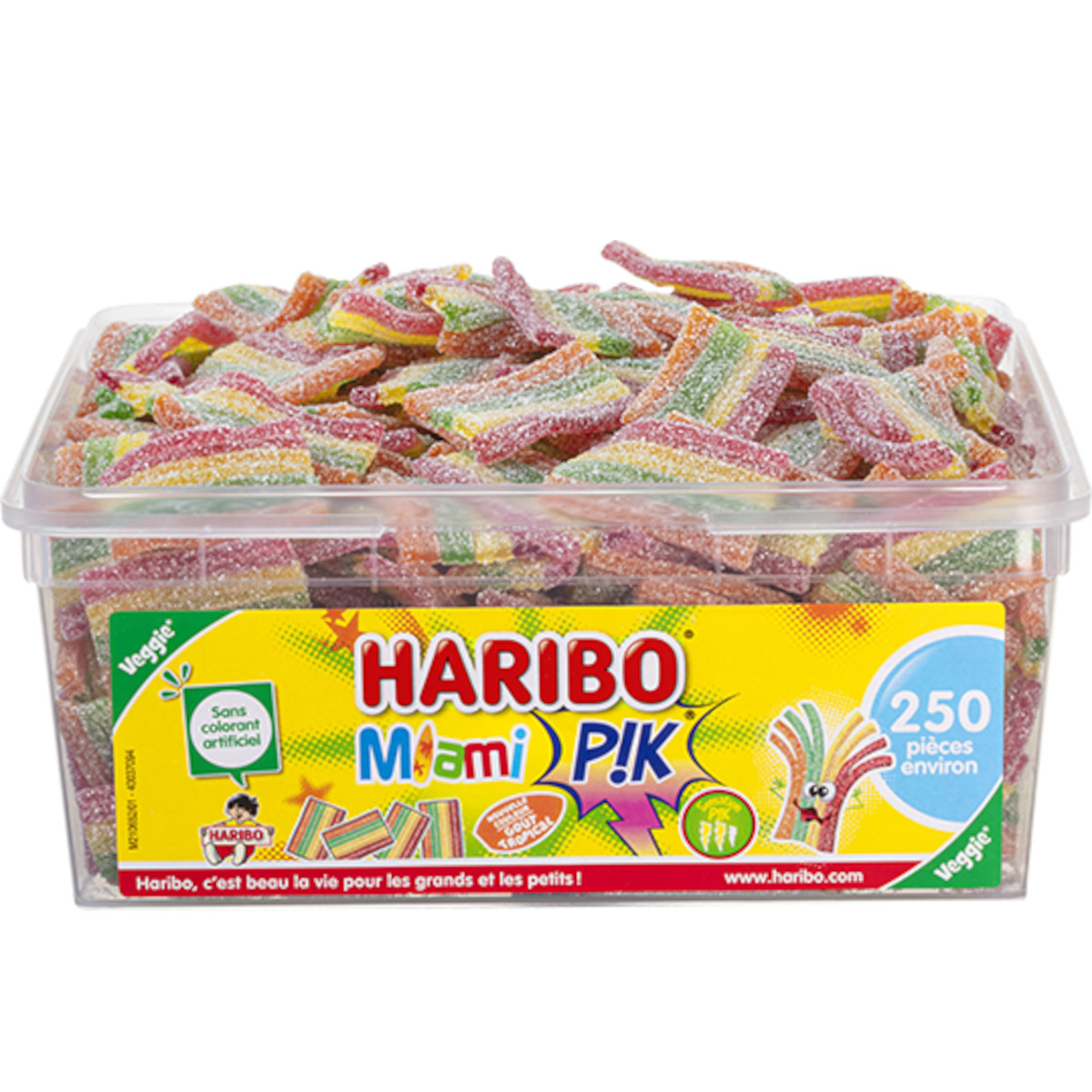 Question ? Combien de bonbons contient la boîte ? Réponse. La boîte contient 210 bonbons Miami Pik HARIBO.