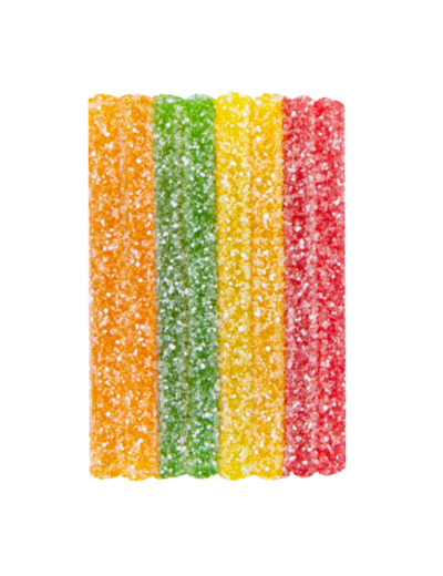 Ingrédients principaux : sucre, sirop de glucose, amidon de maïs, farine de blé, acidifiants naturels, arômes et concentrés de fruits (cassis, baie de sureau, aronie, raisin). Valeur énergétique : 327 kcal pour 100 g. Confiserie fantaisie acidifiée, agent d’enrobage à base de cire de carnauba.
