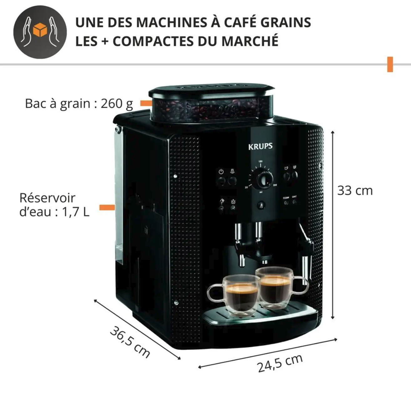 Question ? Quel est le volume de la trémie à grains ? Réponse. Le volume exact n’est pas spécifié, mais le format compact privilégie une capacité adaptée à un usage quotidien.