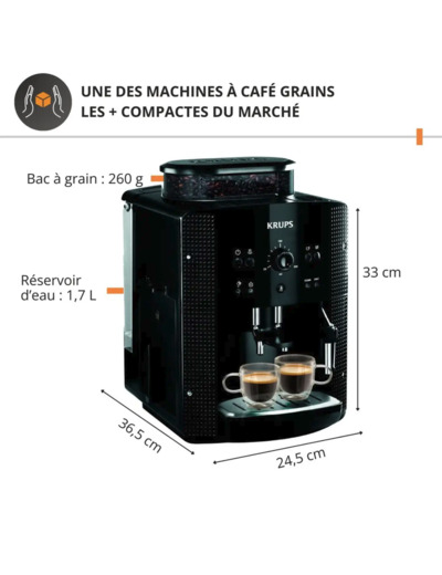 Poids léger et format compact, écran de contrôle noir, broyeur intégré, technologie automatique KRUPS pour un espresso de qualité professionnelle. Indice de réparabilité disponible, écotaxe 2,09 euros.