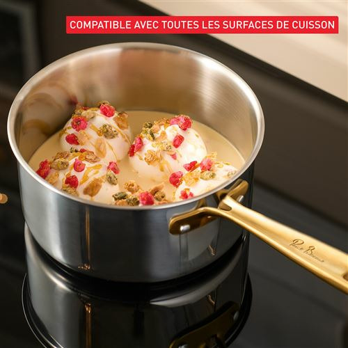 Casserole 16 cm en acier inoxydable sans revêtement, poignée rivetée dorée en acier inoxydable, couvercle en verre avec évent vapeur. Compatible tous feux et four. Fabrication française dans les ateliers Tefal en Bourgogne.