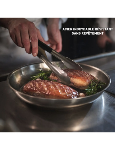 Poêle en acier inoxydable de 24 cm, poignée fixe en acier inoxydable, design signé Paul Bocuse, compatible toutes sources de chaleur, testée par des chefs professionnels, sans information sur le poids ni indice de réparabilité, écotaxe incluse : 0.