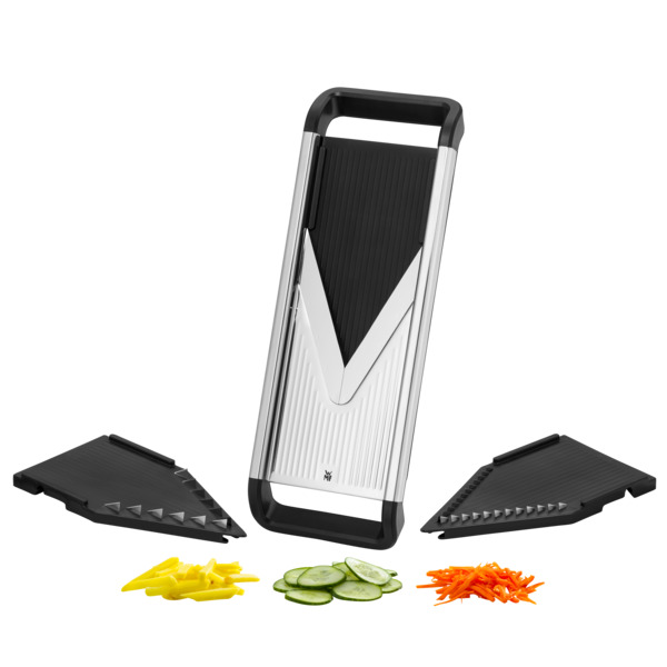 Contenu : 1 mandoline WMF avec 3 grilles interchangeables. Réglage de l’épaisseur par vis sous l’appareil. Matériaux de qualité garantissant solidité et hygiène.