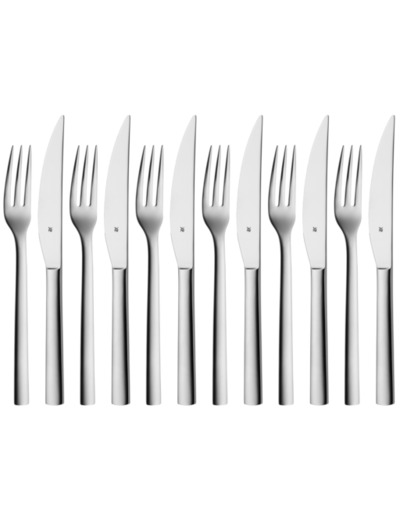 L’ensemble comprend 12 couverts en Cromargan®, matériau inoxydable reconnu pour sa durabilité et son éclat durable. Les couteaux sont forgés d’une seule pièce d’acier inoxydable, avec un bord dentelé spécialement conçu pour une coupe optimale. Tous les éléments passent au lave-vaisselle.