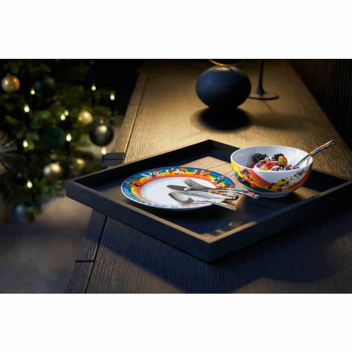 Le set comprend : une fourchette, une cuillère, un couteau, une petite cuillère, une assiette et un bol en porcelaine. Les couverts sont adaptés aux enfants de 3 ans et plus, avec des dimensions et une ergonomie pensées pour leurs petites mains. La lame du couteau est légèrement dentelée pour garantir la sécurité tout en facilitant la découpe. Les matériaux utilisés sont sûrs et durables, conçus en collaboration avec Super RTL.