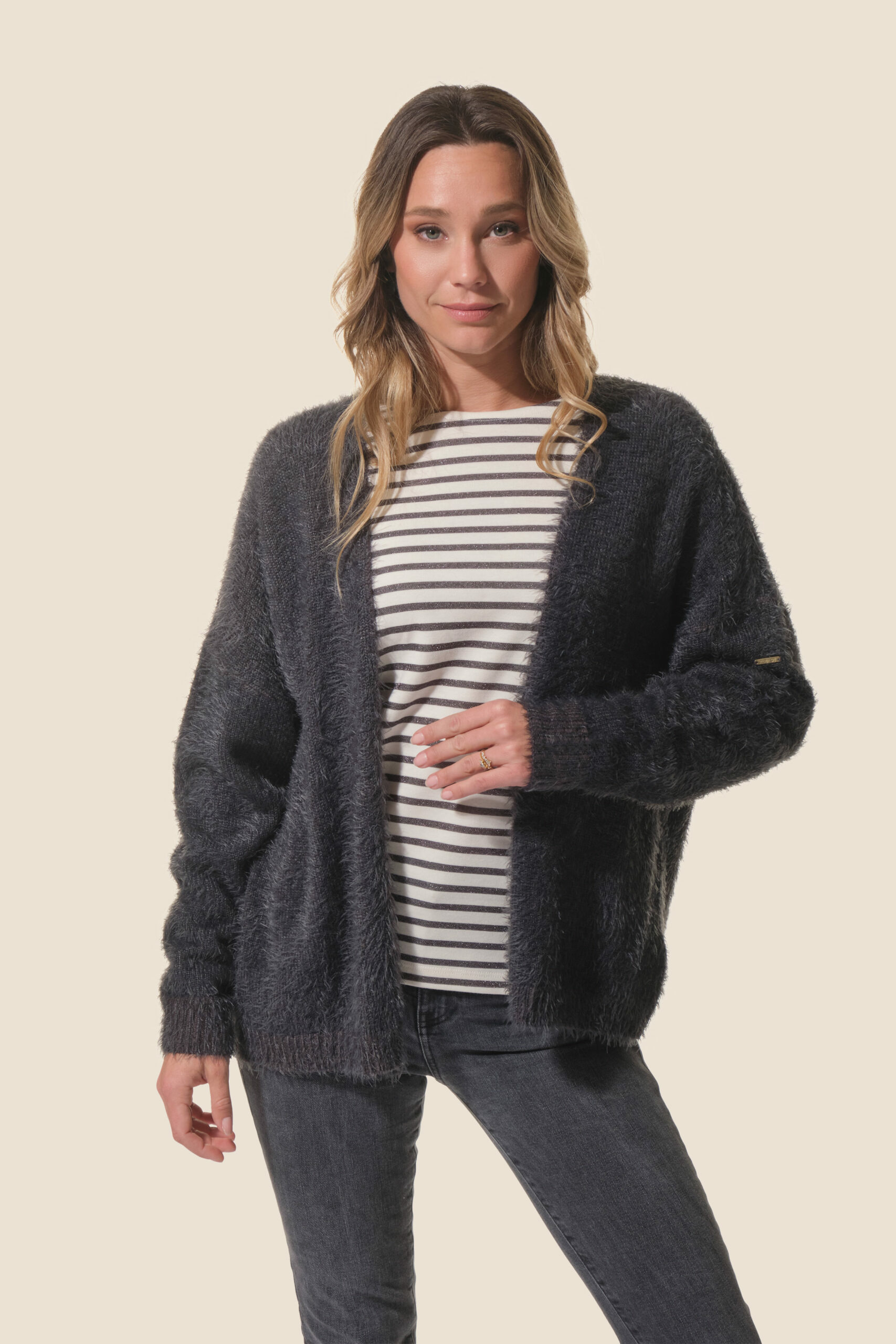 Confectionné dans une matière pilou pilou ultra-douce, ce gilet enveloppe la silhouette d’une chaleur légère sans jamais alourdir. Sa coupe moderne et épurée s’adapte à toutes les occasions, du bureau aux sorties décontractées, pour un style à la fois cosy et raffiné. Facile à porter, il se marie aussi bien avec un jean qu’une jupe fluide.
