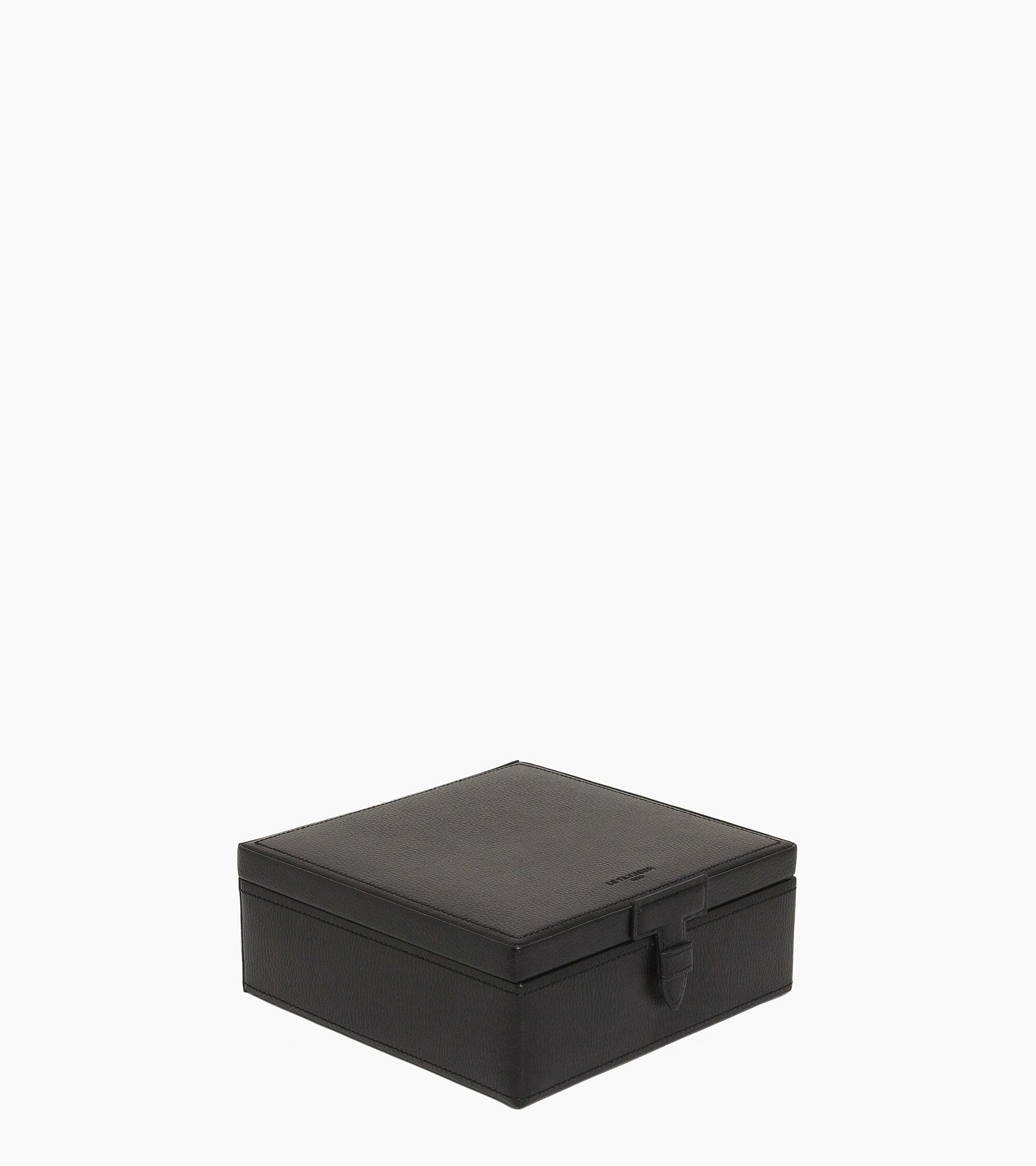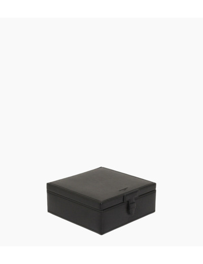 Coffret six montres avec doublure velours, marquage Le Tanneur ton sur ton et fermoir en T signature.Cuir recyclé de vachette. Intérieur velours crépuscule.Largeur : 19 cm x Hauteur : 19 cm x Profondeur : 7 cm