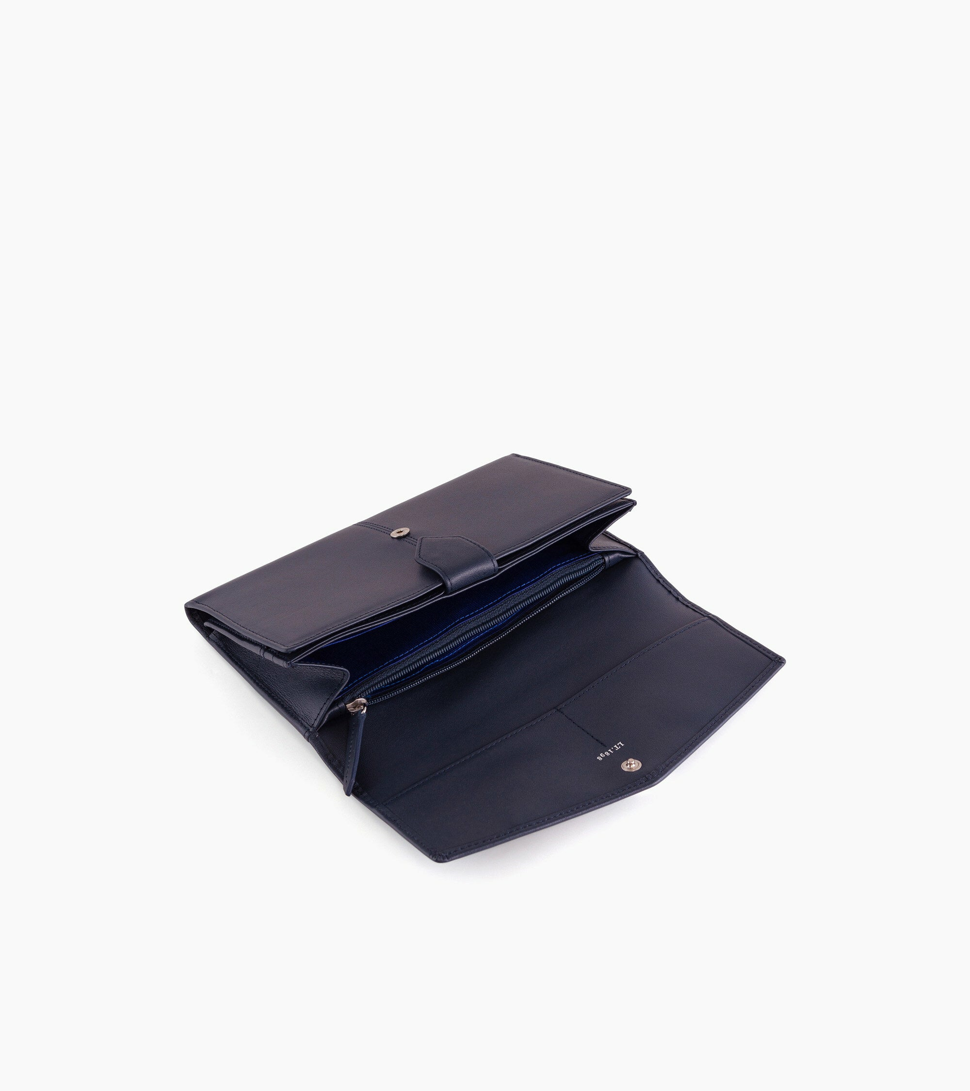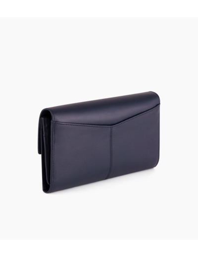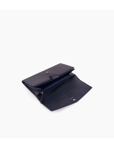 En plus de ses lignes saillantes, son cuir lisse et son intérieur à la fois graphique et moderne. Ce compagnon comporte une doublure Le Bleu signature de la Maison.Cuir de vachette pleine fleur lisse. Doublure textile.2 poches plates, 1 soufflet, 1 poche chéquier, 1 poche zippée monnaie, 1 passant stylo et 12 compartiments cartes, 1 poche plate arrière.Accessoires métalliques finition argent.Largeur : 19 cm x Hauteur : 12 cm
