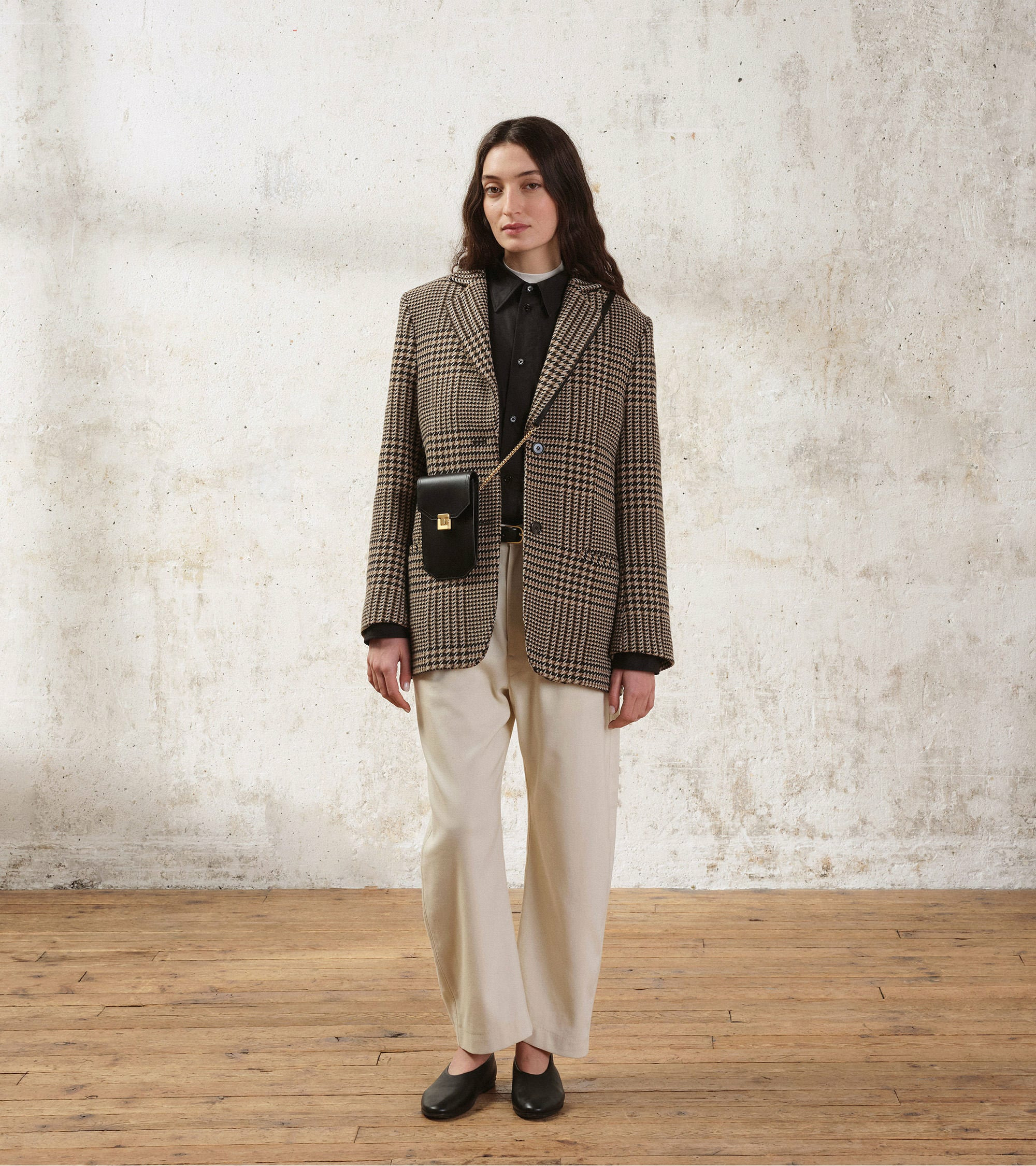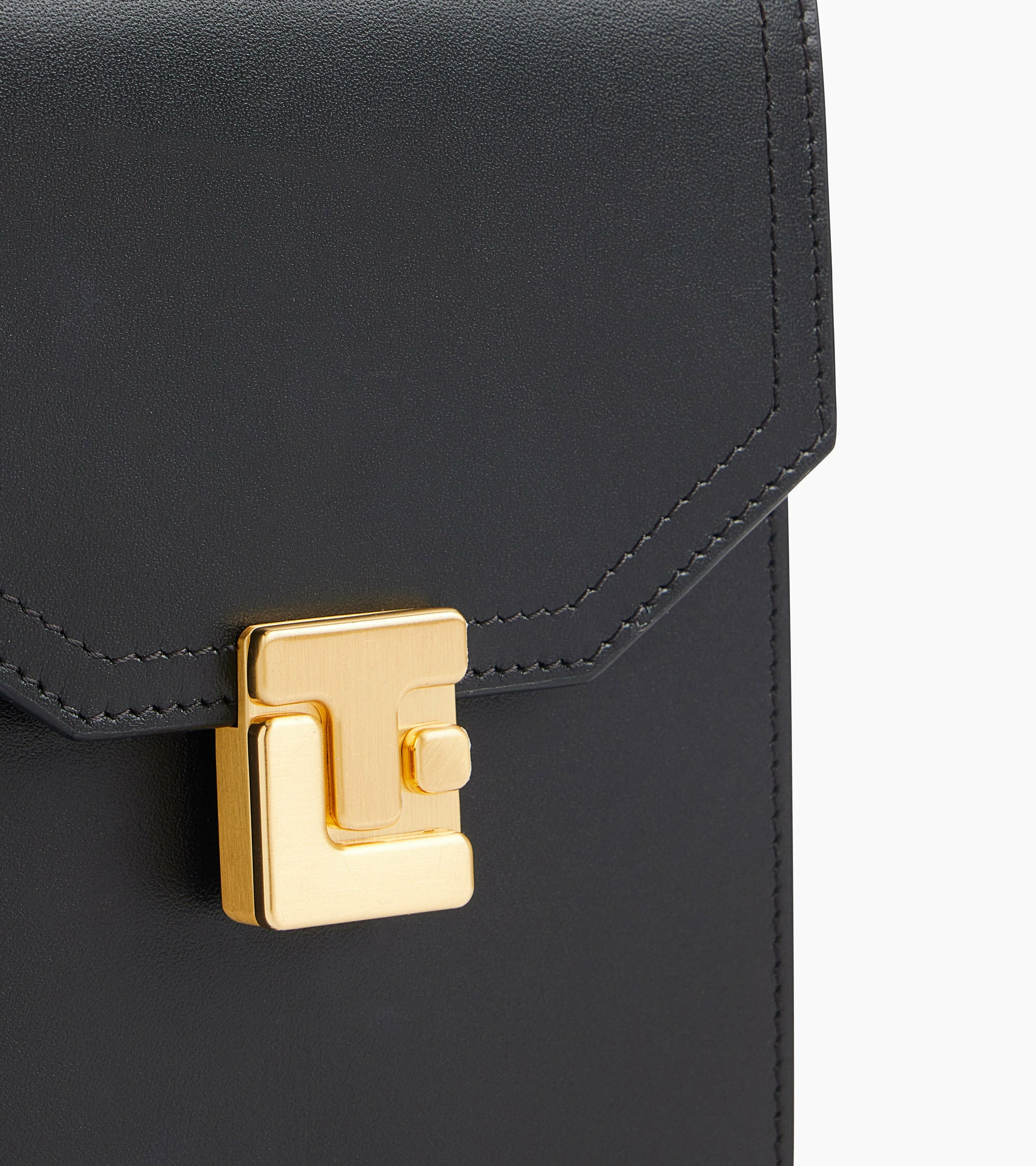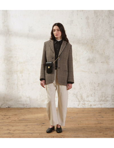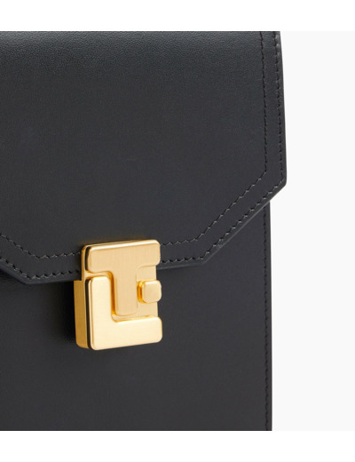 Étui téléphone tour de cou à rabat avec fermoir signature finition doré brossé. Dispose d'une protection RFID.Cuir de vachette pleine fleur lisse. Doublure textile jacquard noir.1 compartiment pour téléphone avec soufflet. 3 compartiments cartes et 1 poche plate arrière.Accessoires métalliques finition doré brossé.Largeur : 11 cm x Hauteur : 18 cm