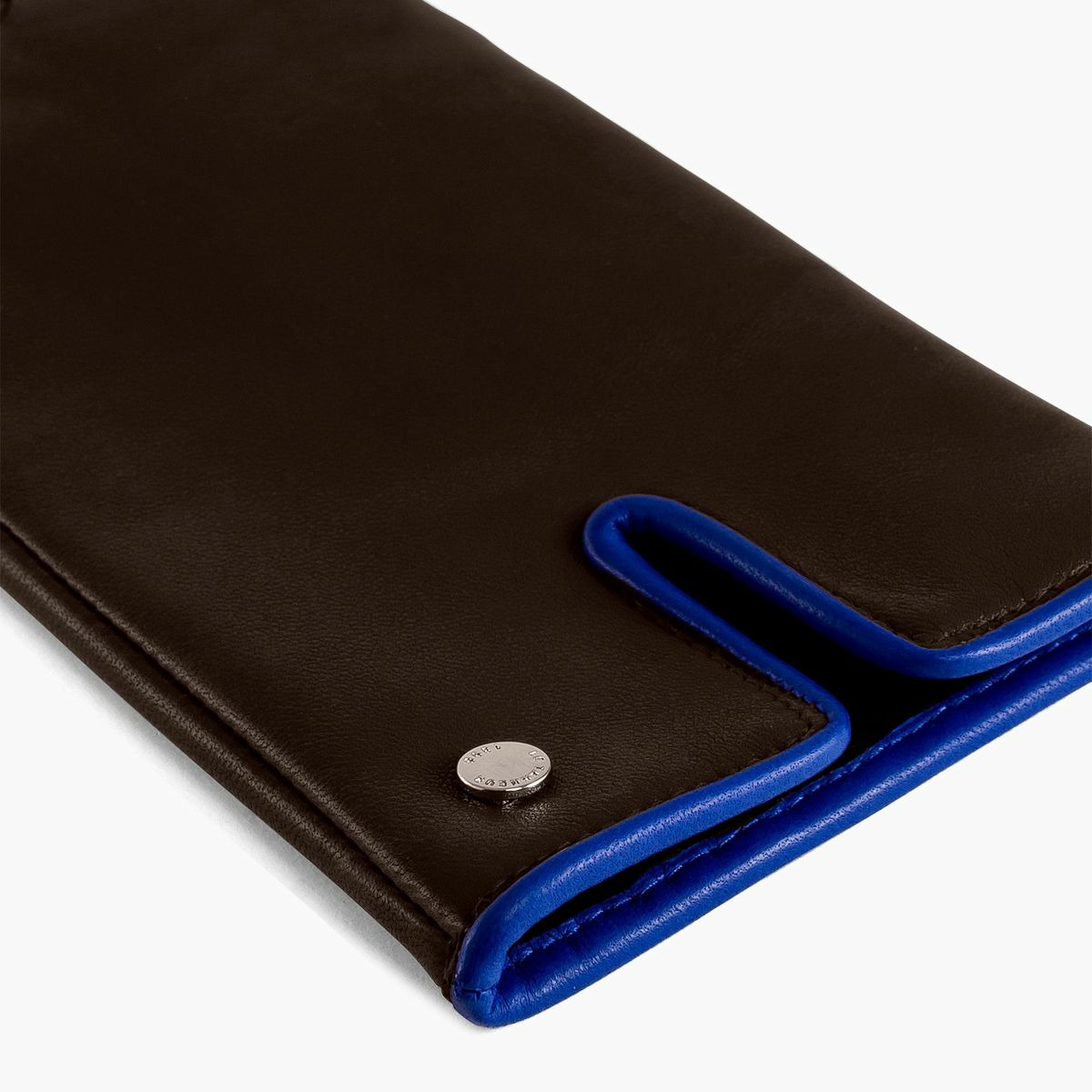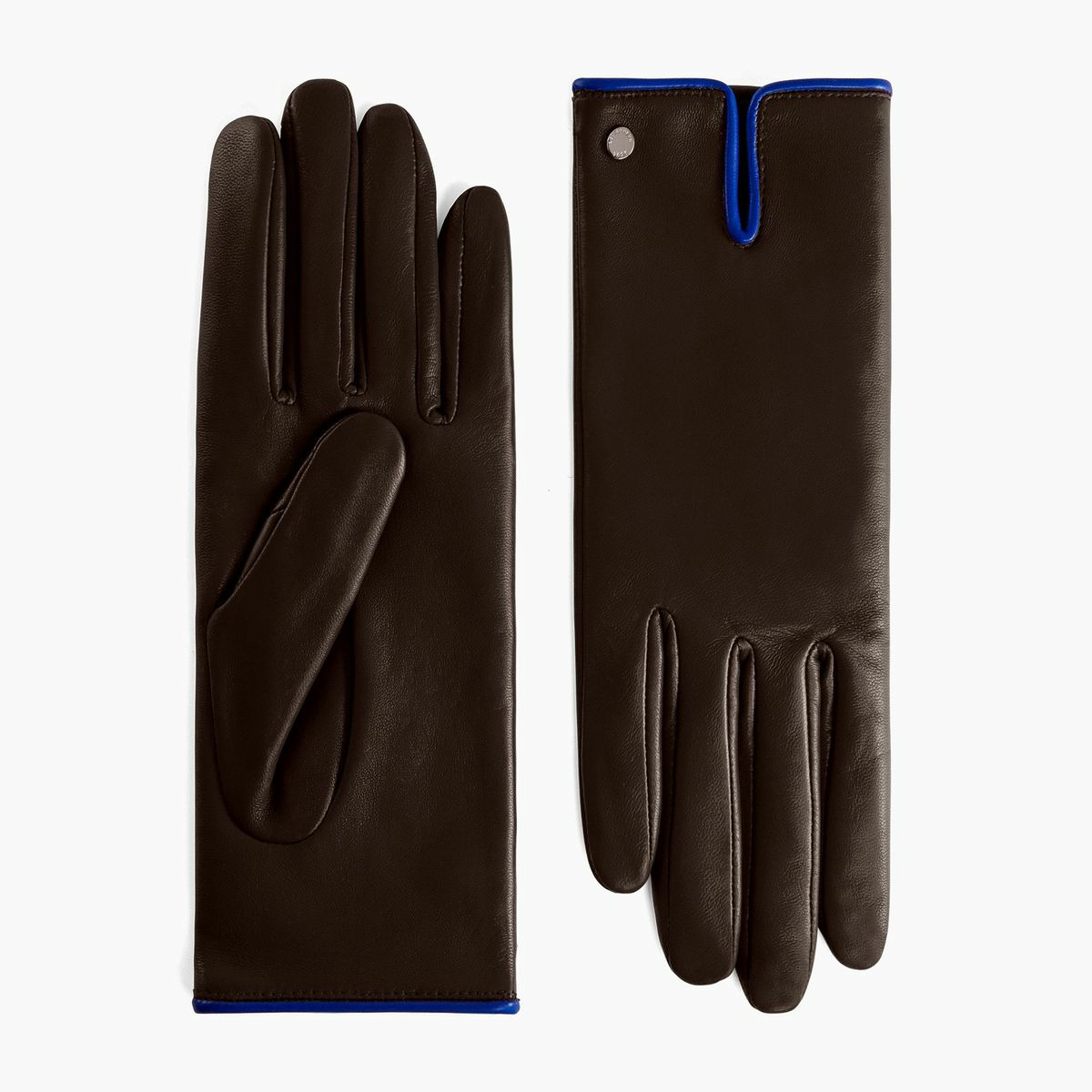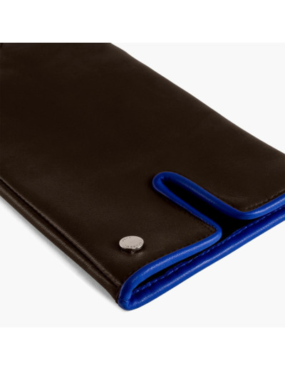 Gants courts avec passepoil couleur bleu, signature de la Maison. Ce modèle comporte également un rivet gravé Le Tanneur. Doublure alpaga.Cuir d’agneau pleine fleur doublure alpaga noir.