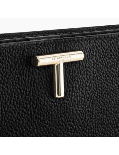 Grand portefeuille avec fermoir signature gravé Le Tanneur.Cuir de vachette pleine fleur grainé. Doublure textile.2 poches plates, 1 poche zippée monnaie 2 soufflets, 1 poche billets, 1 poche ID et 8 compartiments cartes.Accessoires métalliques finition doré clair.Largeur : 19 cm x Hauteur : 9.5 cm
