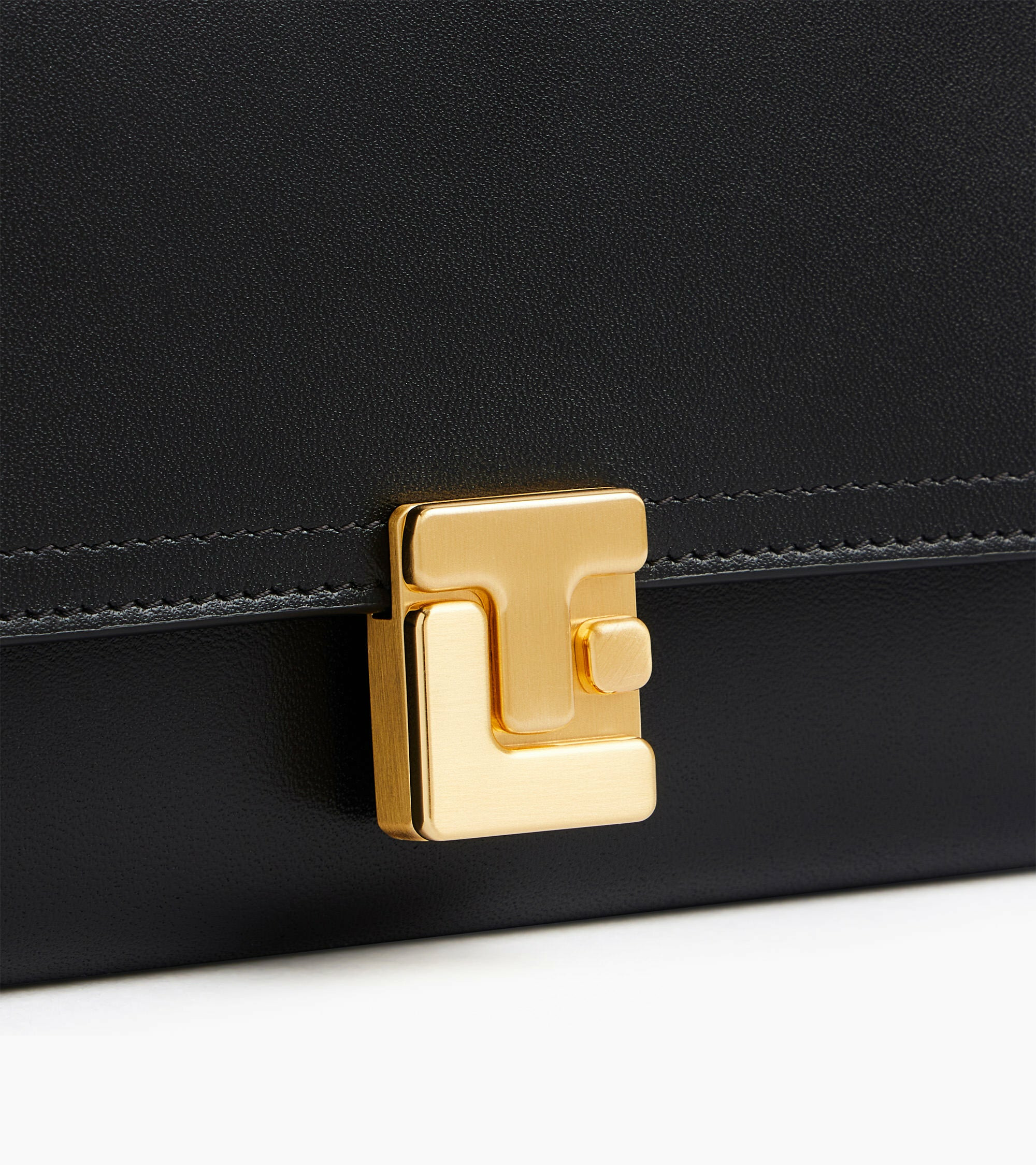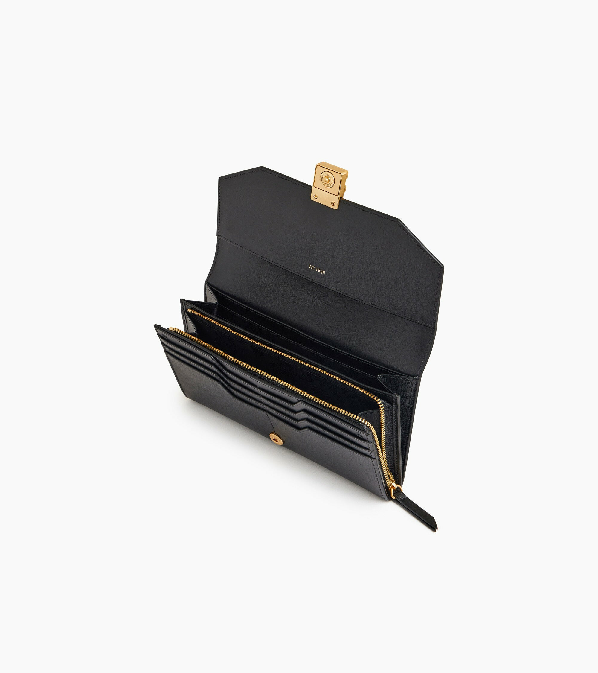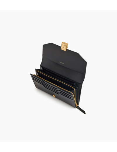 Grand portefeuille avec fermoir signature finition doré brossé et poche monnaie zippée. Dispose d'une protection RFID.Cuir de vachette pleine fleur lisse. Doublure textile jacquard noir.8 compartiments cartes et 1 poche zippée monnaie. 1 soufflet, 6 compartiments cartes et 2 poches plates. 1 poche plate arrière.Accessoires métalliques finition doré brossé.Largeur : 19 cm x Hauteur : 11 cm x Profondeur : 2 cm