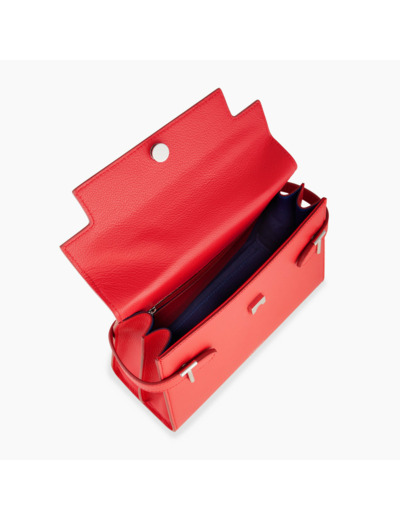 Dimensions adaptées pour un grand sac à main : hauteur 28 cm, largeur 35 cm, profondeur 12 cm. Cuir grainé pleine fleur, doublure textile, fermeture à rabat avec bouton magnétique. Bandoulière réglable et amovible. Poches intérieures zippées et ouvertes pour une organisation optimale.