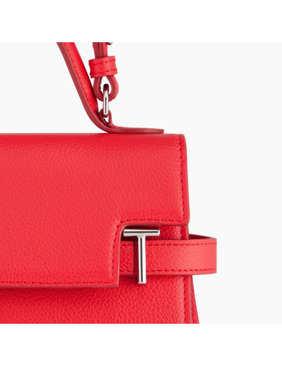 Grand sac à main à rabat avec charms et fermoirs T signature. Porté main, épaule ou croisé grâce à sa bandoulière ajustable et amovible.Cuir de vachette pleine fleur grainé. Doublure textile Le Bleu.1 poche plate et une poche zippée, 1 poche plate arrière. Bandoulière amovible et ajustable.Accessoires métalliques finition argent.Largeur : 26 cm x Hauteur : 21 cm x Profondeur : 9 cm