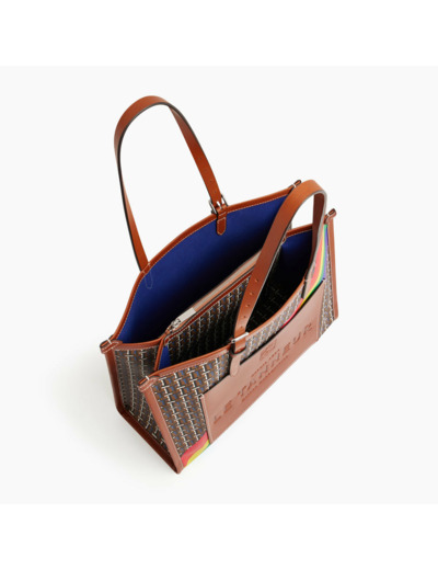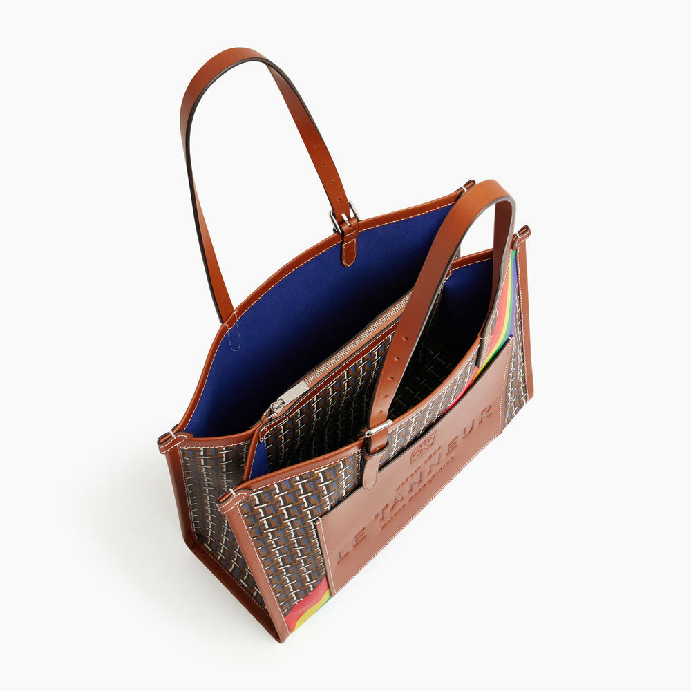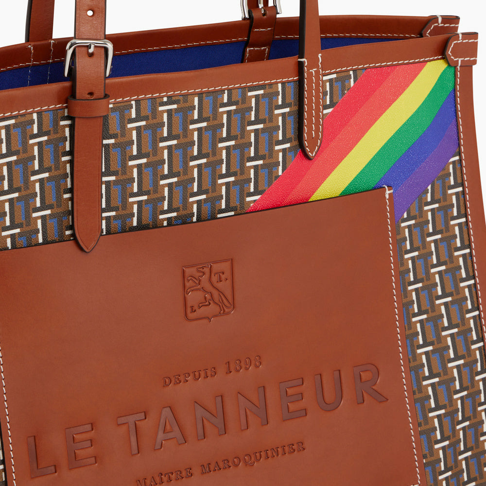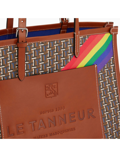 Grand sac cabas bi-matière avec marquage Le Tanneur ton sur ton et éléments métalliques finition argent. Porté main ou épaule. En plus de ses engagements financiers annuel, Le Tanneur reversera 20% des bénéfices sur les ventes de la capsule à l’association Inter-LGBT.toile monogramme et cuir lisse de vachette pleine fleur à tannage végétal. Doublure textile Le Bleu.1 poche plate avant, 1 poche plate et 1 poche zippée.Accessoires métalliques finition argent.Largeur : 41 cm x Hauteur : 32 cm x Profondeur : 14 cm