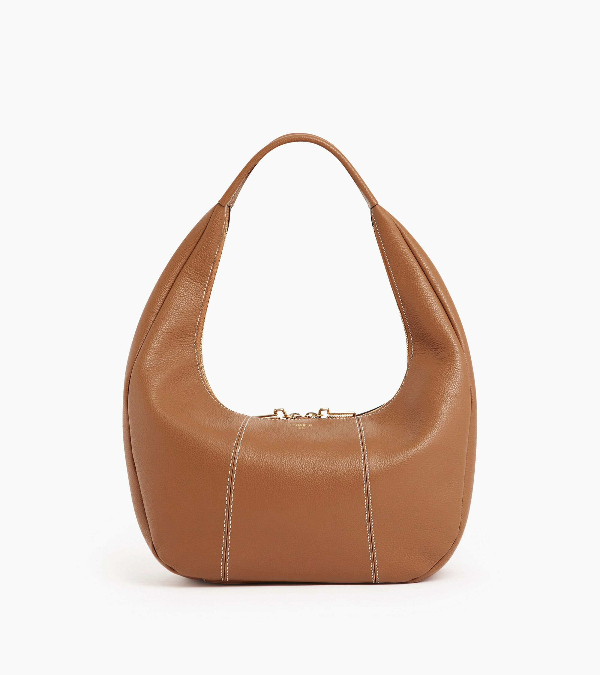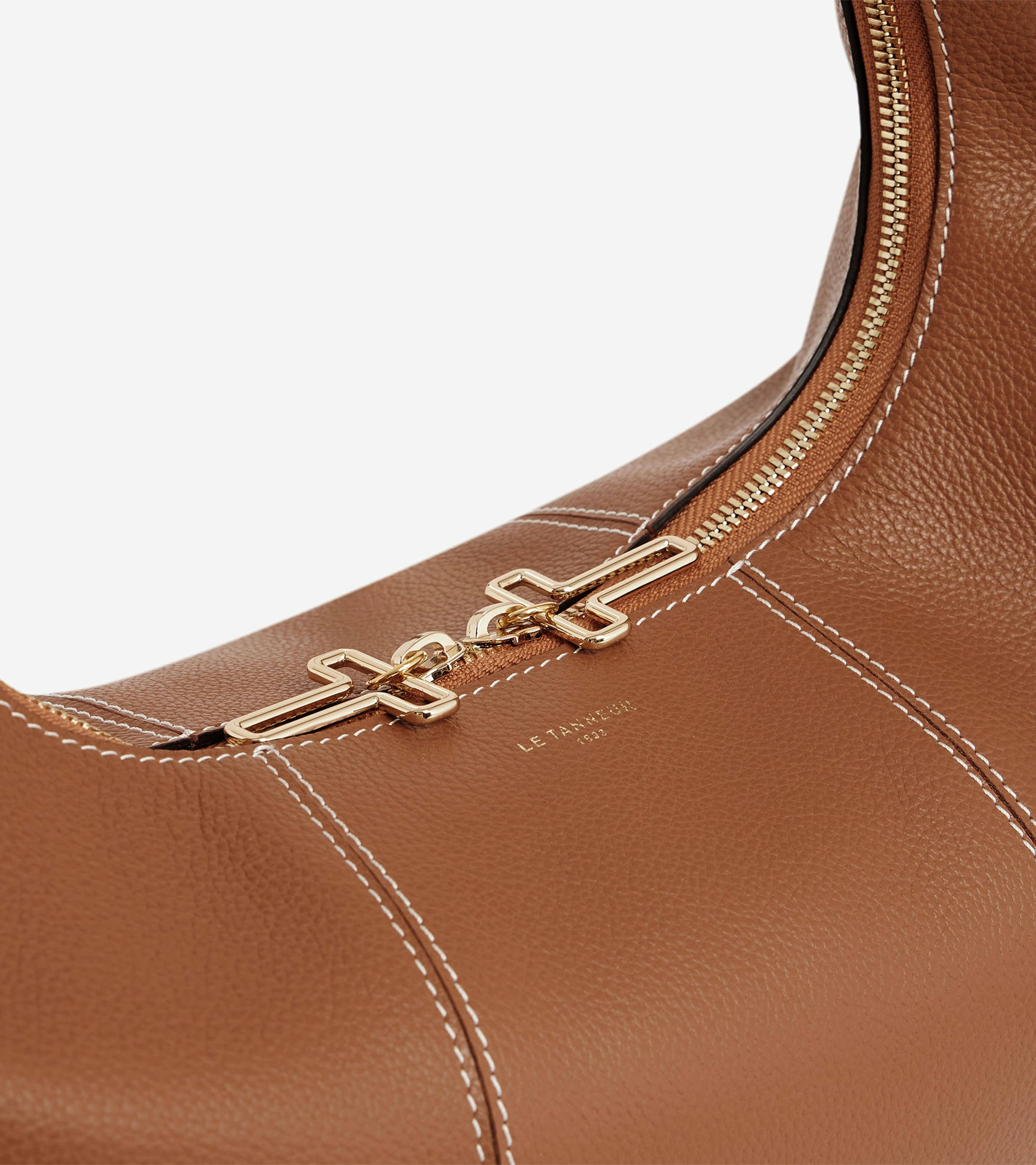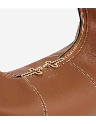 Grand sac hobo avec zip signature double fermeture et marquage Le Tanneur. Porté main.Cuir de vachette pleine fleur grainé. Doublure textile.1 poche plate avant et 1 poche zippée.Accessoires métalliques finition doré clair.Largeur : 33 cm x Hauteur : 19 cm x Profondeur : 14 cm