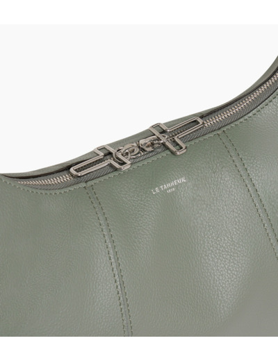 Sac hobo moyen format avec zip signature double fermeture et marquage Le Tanneur. Porté main.Cuir de vachette pleine fleur grainé. Doublure textile jacquard.1 poche plate avant et 1 poche zippée.Accessoires métalliques finition argent.Largeur : 33 cm x Hauteur : 19 cm x Profondeur : 14 cm