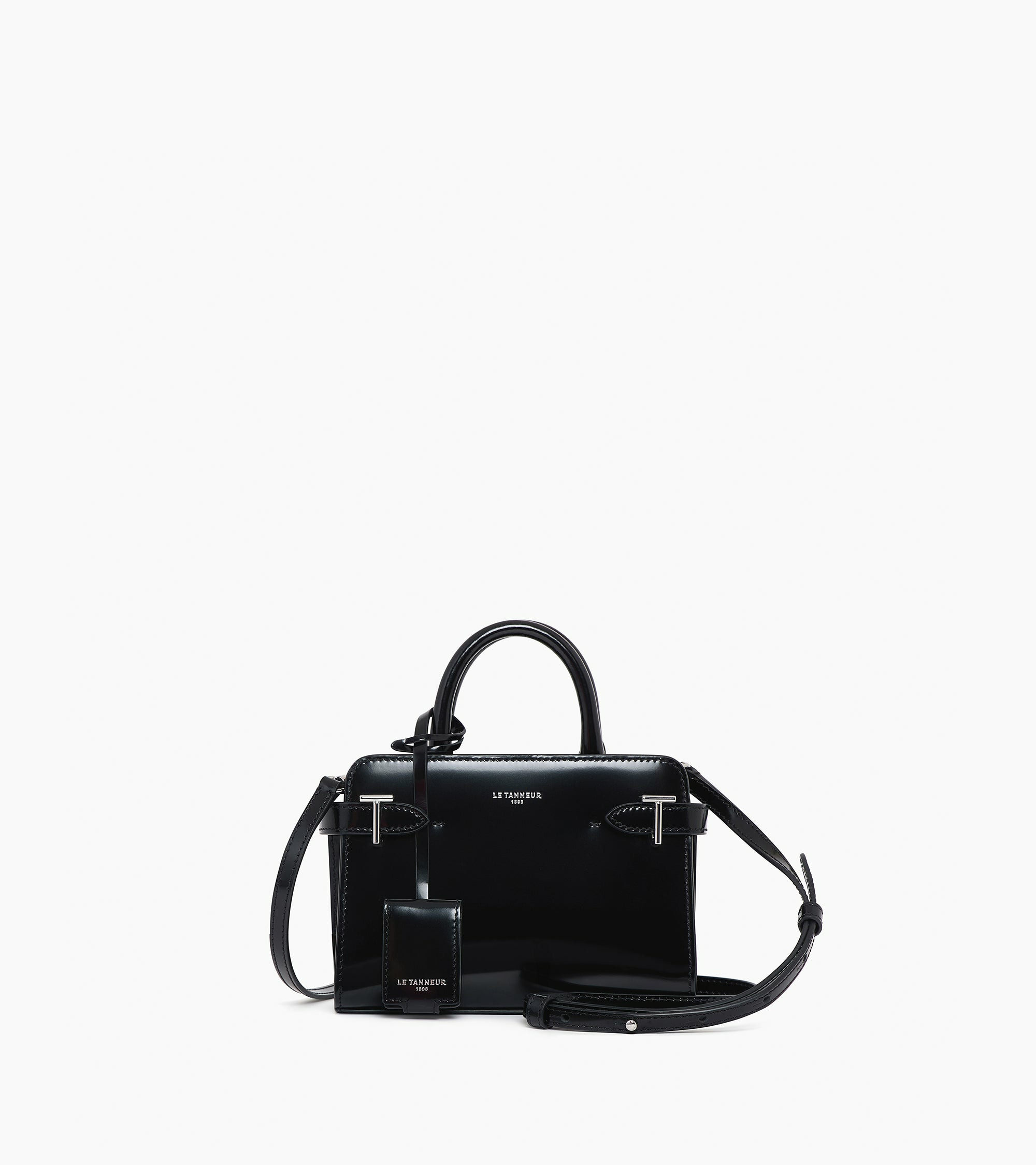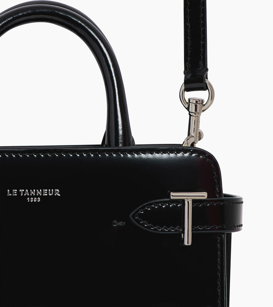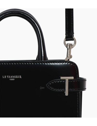 Sac à main mini modèle avec double T signature, charms amovible et doublure jacquard anniversaire. Marquage Le Tanneur et éléments métalliques finition argent. Porté main, épaule ou croisé grâce à sa bandoulière ajustable et amovible.Cuir corrigé de vachette effet box. Doublure textile jacquard anniversaire noir.1 poche plate. Bandoulière ajustable et amovibleAccessoires métalliques finition argent.Largeur : 19 cm x Hauteur : 14 cm x Profondeur : 6 cm