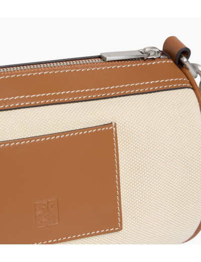 Mini sac bandoulière bi-matière avec poche zippée et empiècement cuir embossé Le Tanneur. Porté croisé grâce à sa bandoulière ajustable et amovible.Cuir de vachette 100% coton et pleine fleur. Toile naturelle coton & cuir lisse tannage semi végétal. Doublure textile Le Bleu.1 poche zippée. 1 poche plate avant. Bandoulière ajustable.Accessoires métalliques finition argent brossé.Largeur : 22 cm x Hauteur : 12 cm x Profondeur : 1 cm