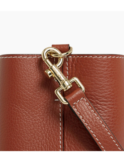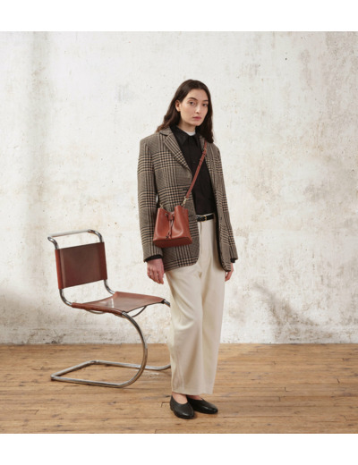 Dimensions compactes, cuir grainé pleine fleur, fermeture par cordon coulissant, bandoulière ajustable, doublure textile, poche intérieure zippée.