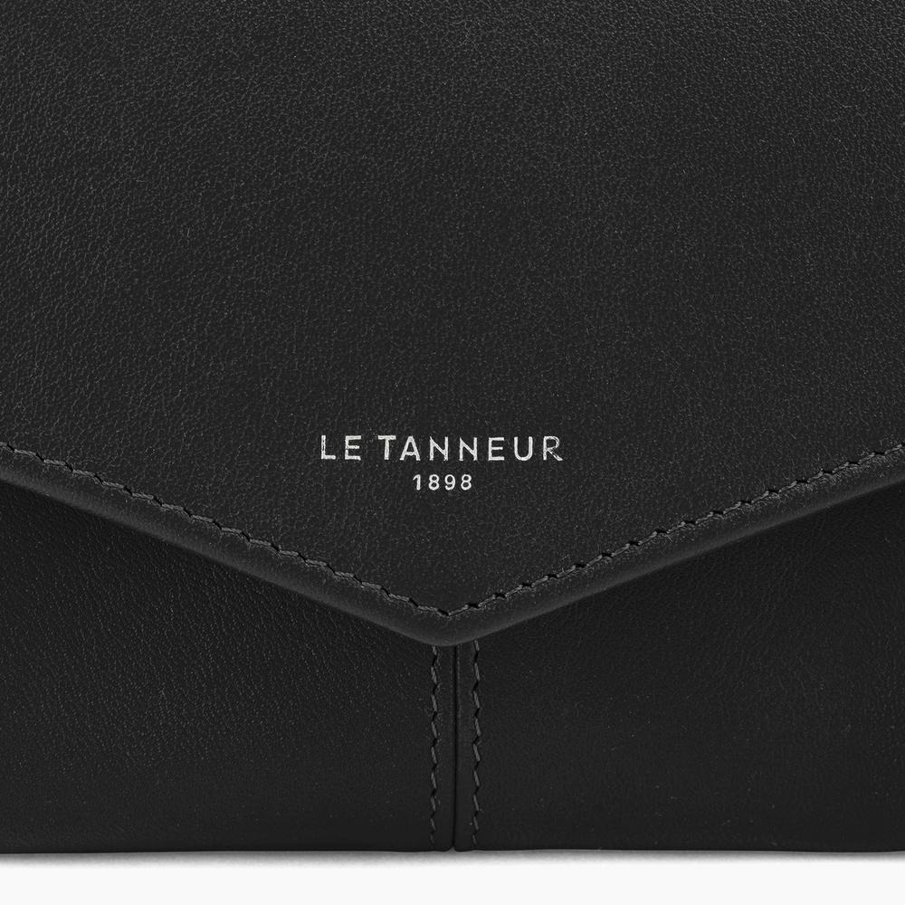 Dimensions compactes, cuir lisse pleine fleur, fermeture par rabat, plusieurs emplacements pour cartes, compartiment pour billets, fabrication française par Le Tanneur.