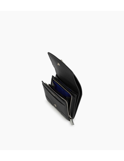 Petit portefeuille à rabat avec poche zippée. Marquage Le Tanneur et fermeture pression finition argent. Sécurité anti-RFID.Cuir de vachette pleine fleur grainé. Doublure textile Le Bleu.1 poche plate, 1 poche zippée monnaie, 2 soufflets, 1 soufflet. 4 compartiments cartes, 1 poche billet.Accessoires métalliques finition argent.Largeur : 14 cm x Hauteur : 10 cm
