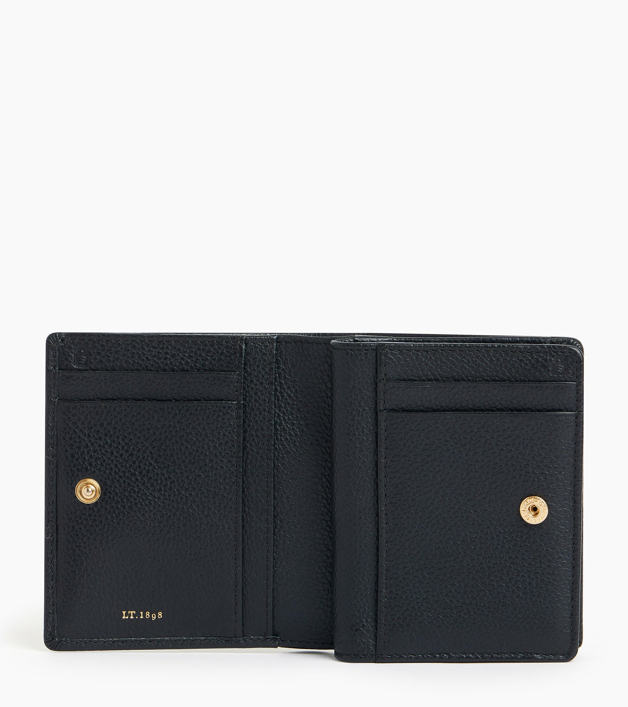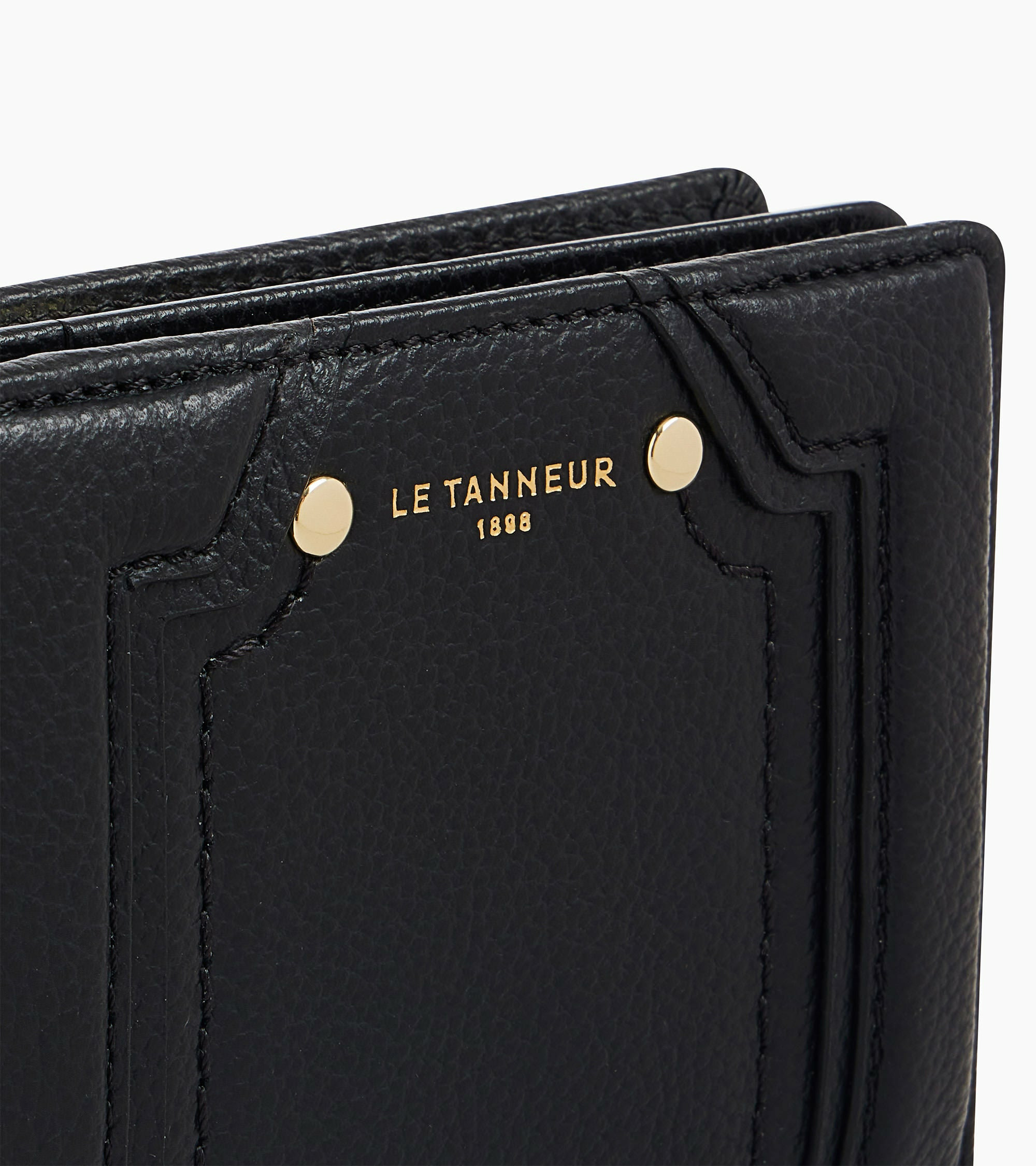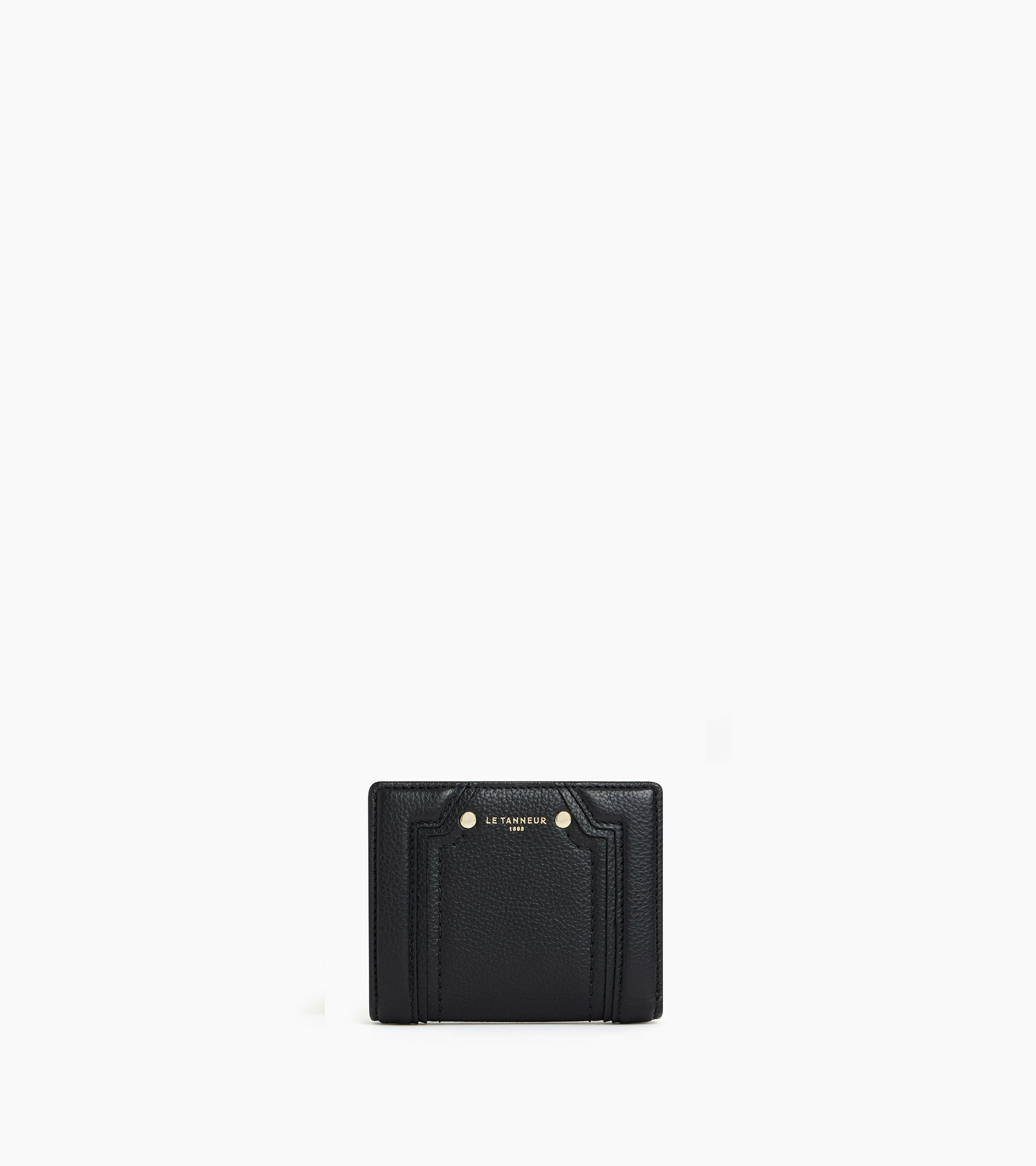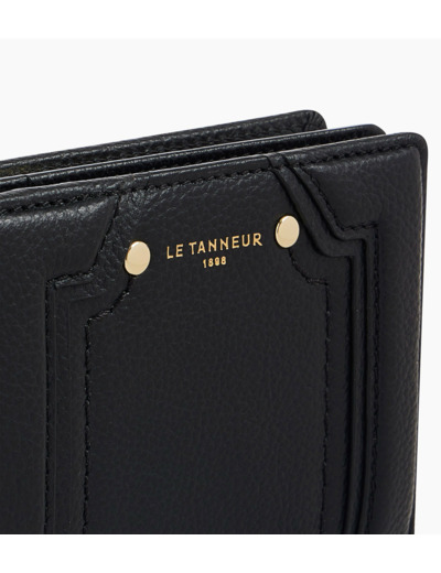 Petit portefeuille avec fermeture pression, poche monnaie zippée et marquage Le Tanneur. Dispose d'une protection RFID.Cuir de vachette pleine fleur grainé. Doublure textile jacquard noir.3 poches plates, 1 poche zippée monnaie, 1 poche billets et 4 compartiments cartes.Accessoires métalliques finition doré clair.Largeur : 10 cm x Hauteur : 8 cm