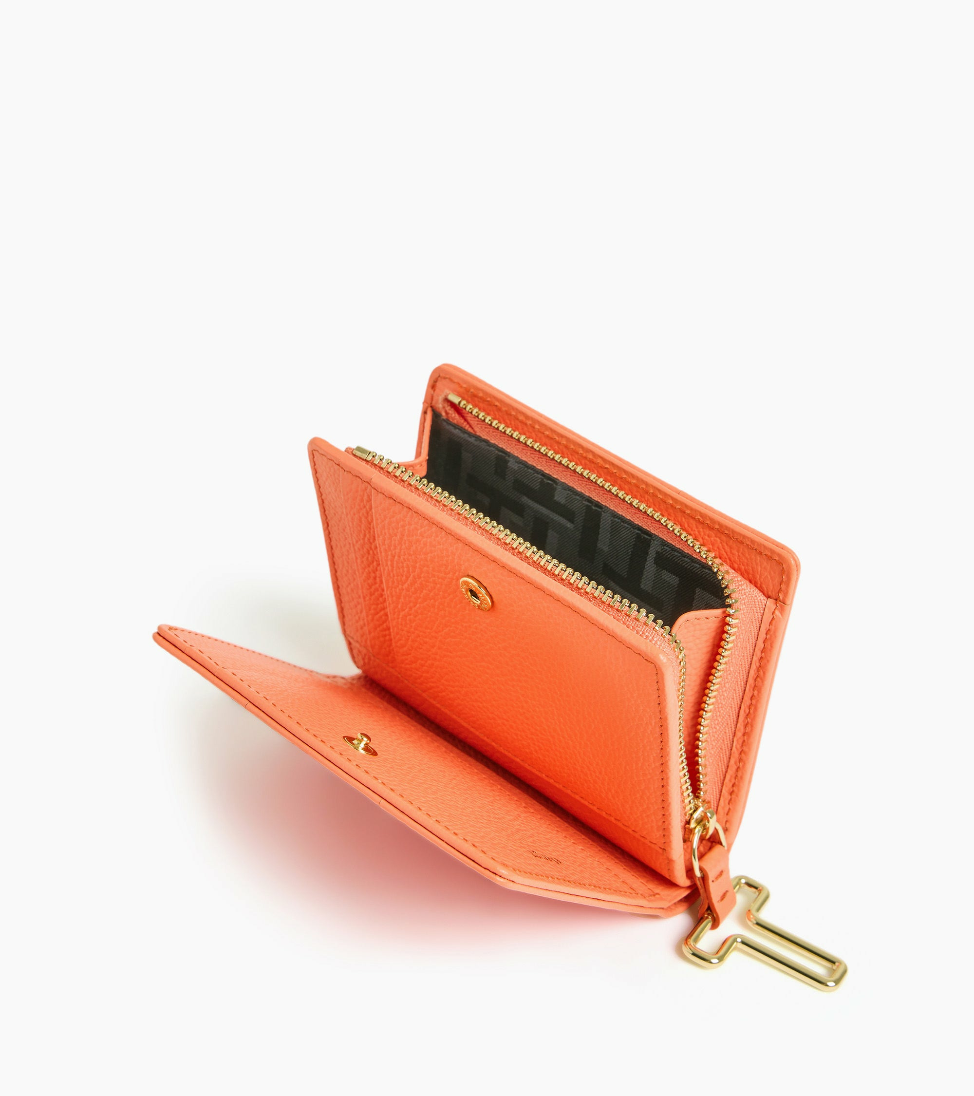 Petit portefeuille avec fermeture pression, marquage Le Tanneur et poche monnaie zip T signature.Cuir de vachette pleine fleur grainé. Doublure textile jacquard.1 poche monnaie zippée, 1 soufflet. 1 poche billets, 3 poches plates et 4 compartiments cartes.Accessoires métalliques finition doré clair.Largeur : 9 cm x Hauteur : 11 cm