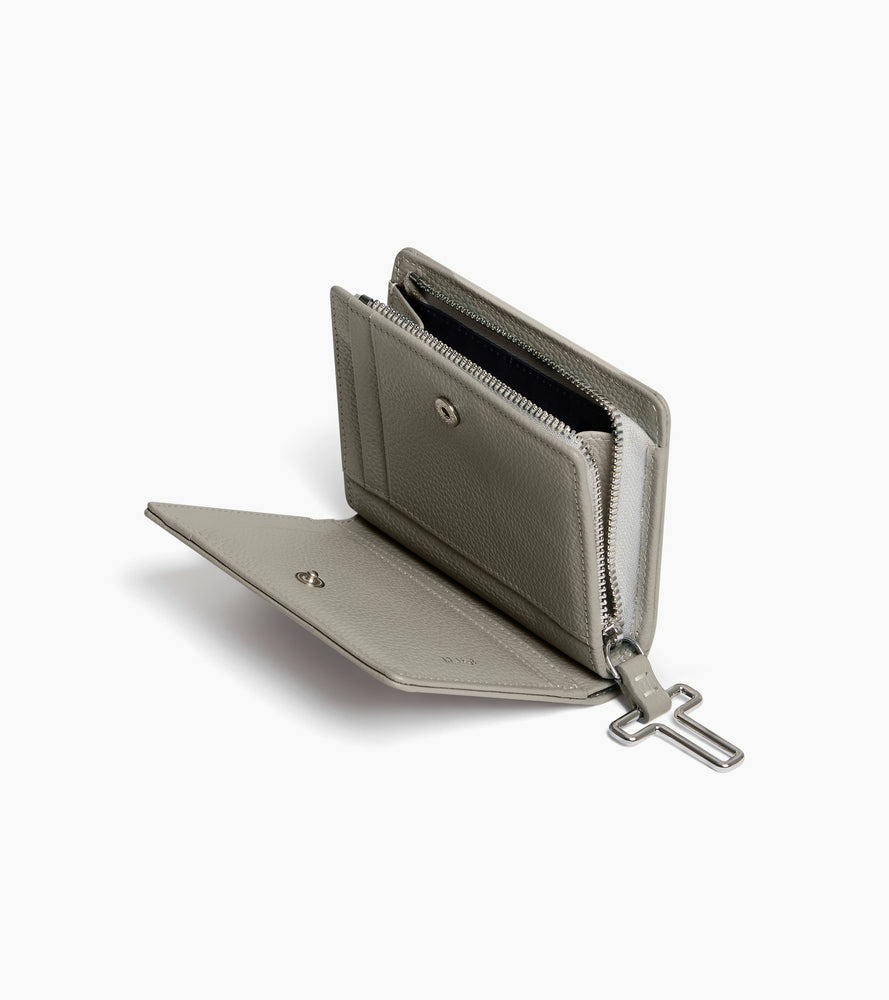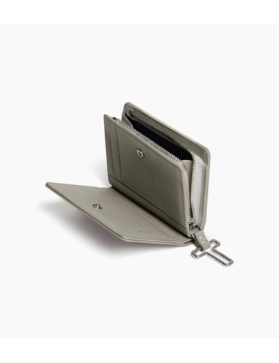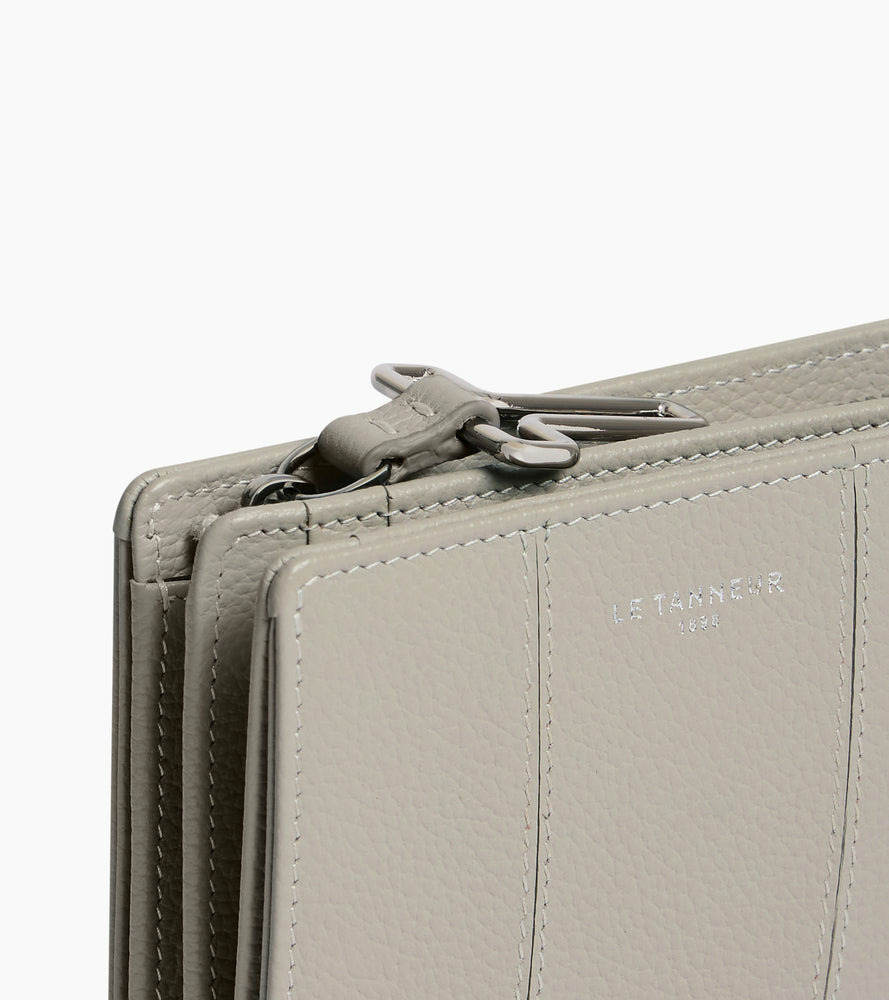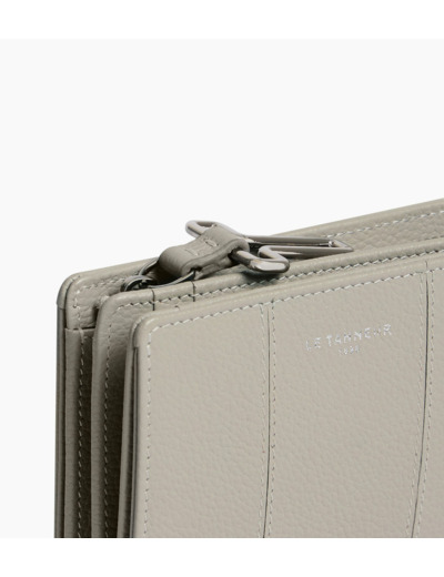 Petit portefeuille avec fermeture pression, marquage Le Tanneur et poche monnaie zip T signature.Cuir de vachette pleine fleur grainé. Doublure textile jacquard T crépuscule.1 poche monnaie zippée, 1 soufflet. 1 poche billets, 3 poches plates et 4 compartiments cartes.Accessoires métalliques finition argent.Largeur : 9 cm x Hauteur : 11 cm x Profondeur : 1 cm