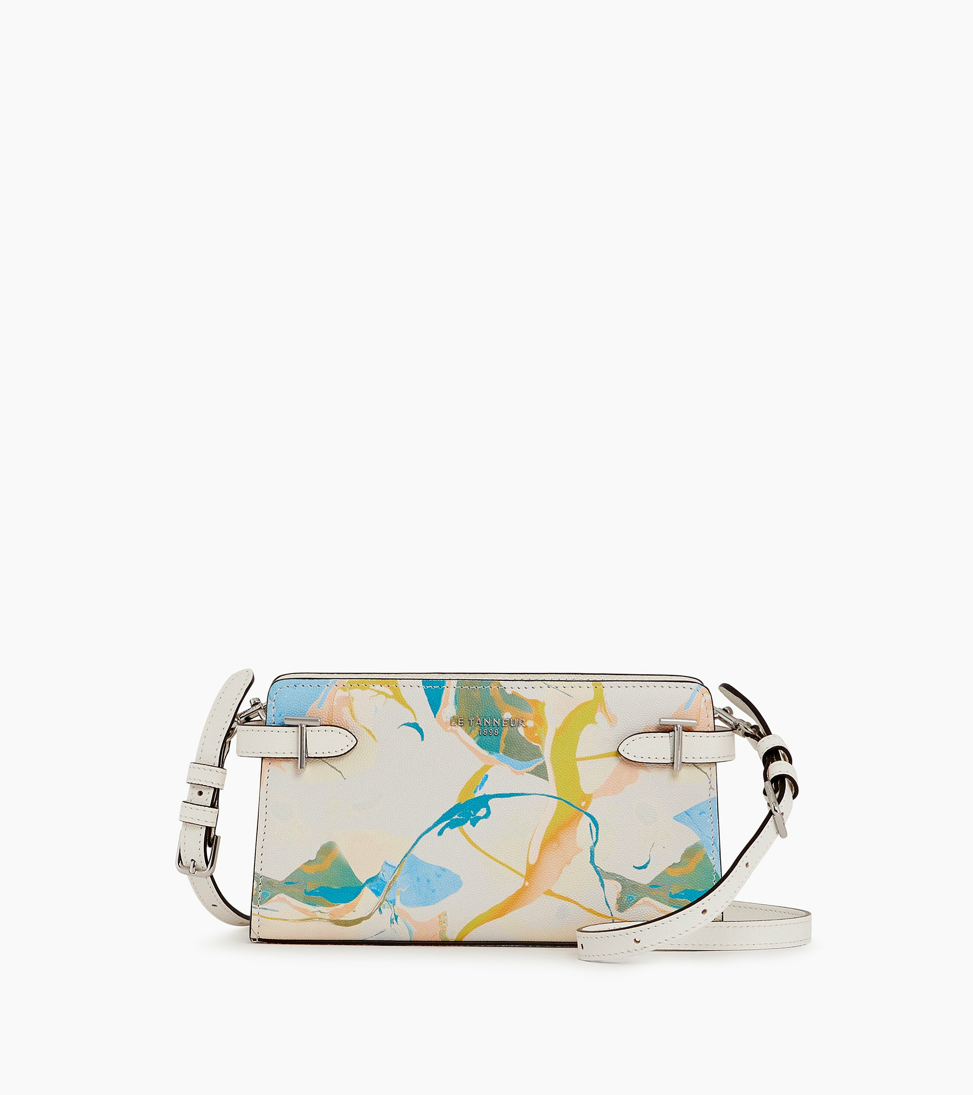 Sac baguette imprimé avec fermoirs T signature et marquage Le Tanneur finition argent. Porté main, épaule ou croisé grâce à sa bandoulière ajustable et amovible.Cuir de vachette pleine fleur grain caviar. Doublure textile Le Bleu.1 poche plate. 1 poche plate arrière. Bandoulière amovible et ajustable.Accessoires métalliques finition argent.Largeur : 23.5 cm x Hauteur : 13.5 cm x Profondeur : 4 cm