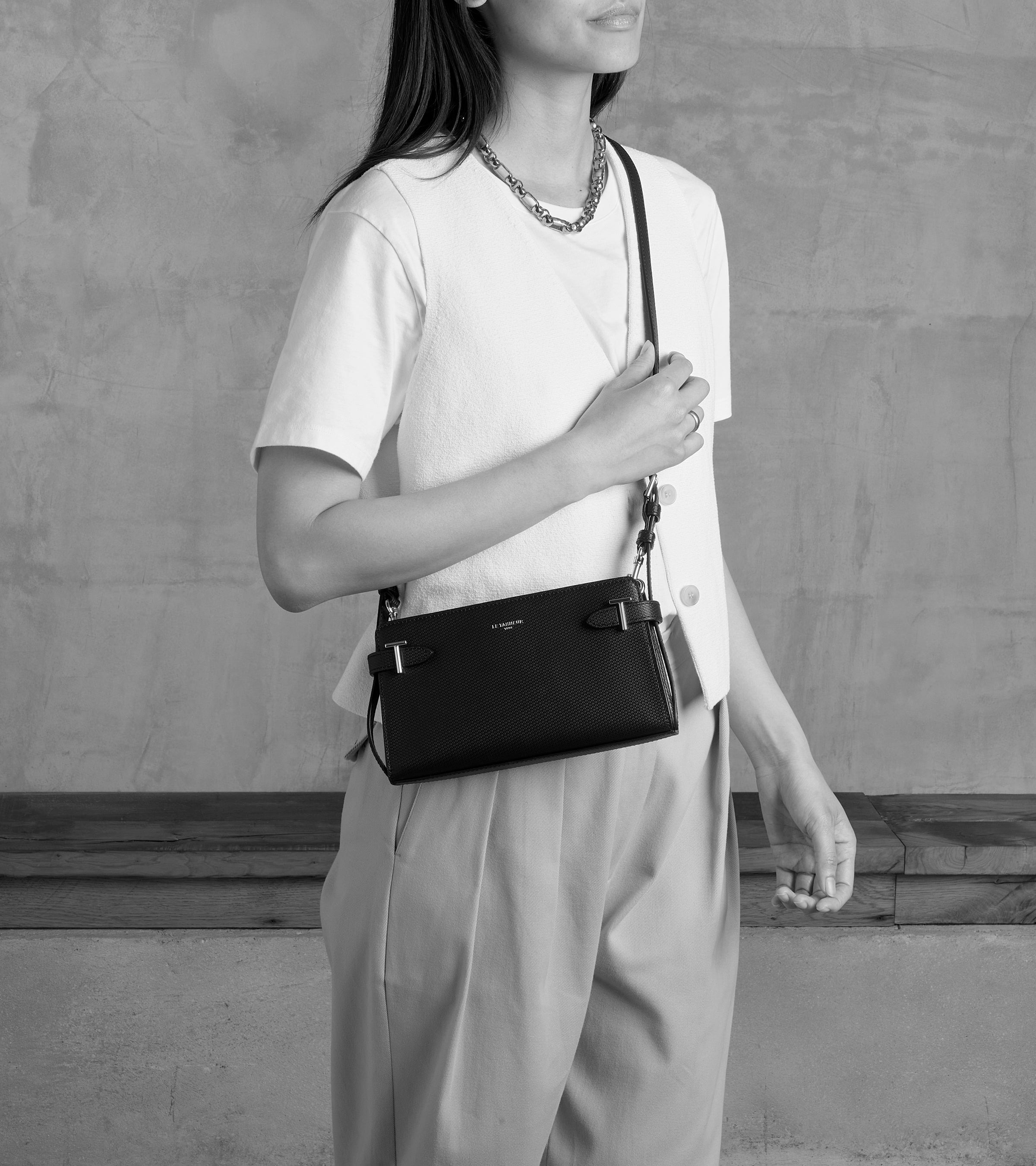 Petit sac à bandoulière avec bijouterie T signature et marquage Le Tanneur. Porté main, épaule ou croisé grâce à sa bandoulière ajustable et amovible.Cuir de vachette signature T. Doublure textile Le Bleu1 poche plate. 1 poche plate arrière. Bandoulière amovible et tajustable.Accessoires métalliques finition argent.Largeur : 23.5 cm x Hauteur : 13.5 cm x Profondeur : 4 cm