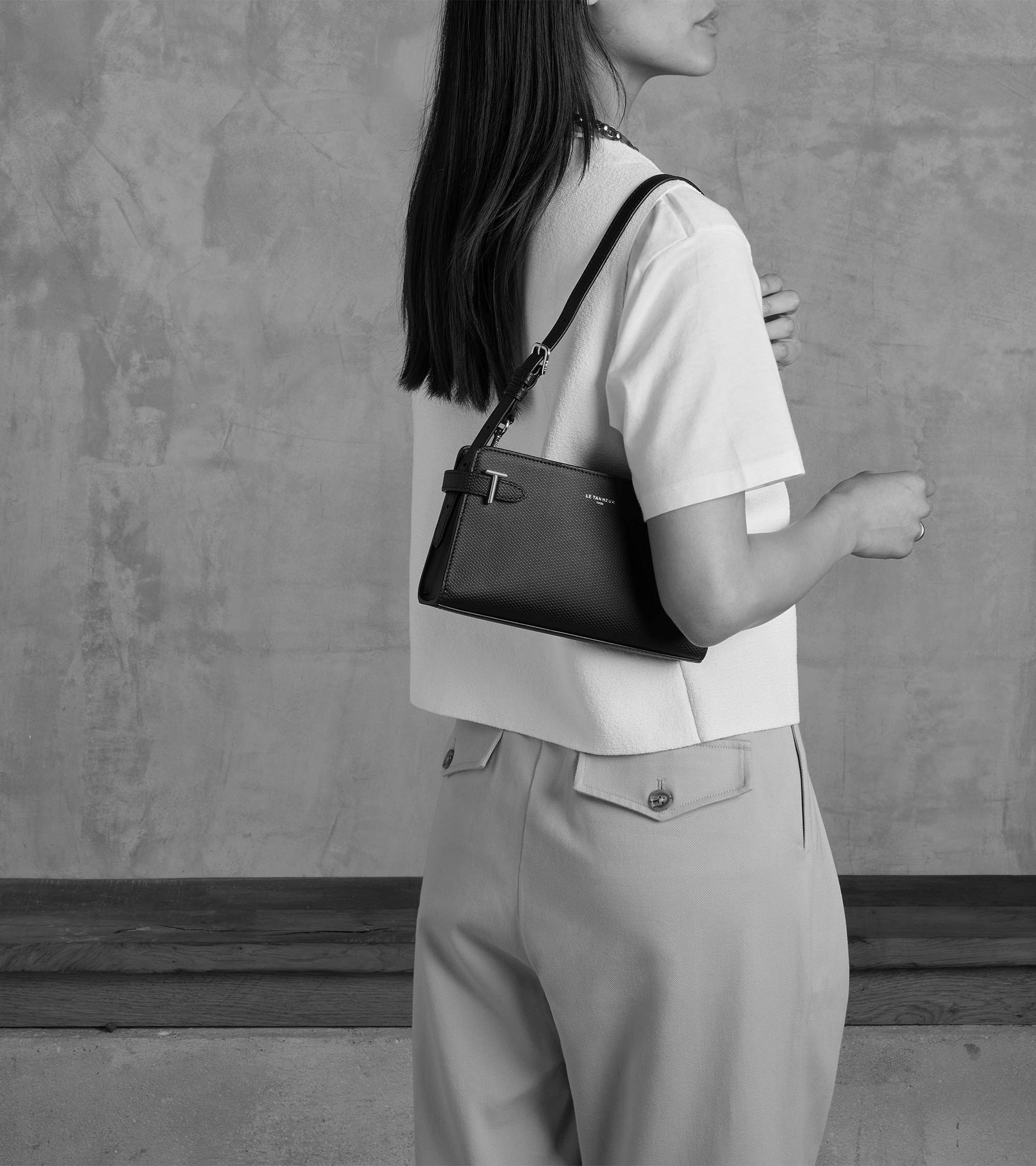 Sac baguette avec bijouterie T signature et marquage Le Tanneur. Porté main, épaule ou croisé grâce à sa bandoulière ajustable et amovible.Cuir de vachette signature T. Doublure textile Le Bleu.1 poche plate. 1 poche plate arrière. Bandoulière amovible et tajustable.Accessoires métalliques finition argent.Largeur : 23 cm x Hauteur : 13 cm x Profondeur : 4 cm