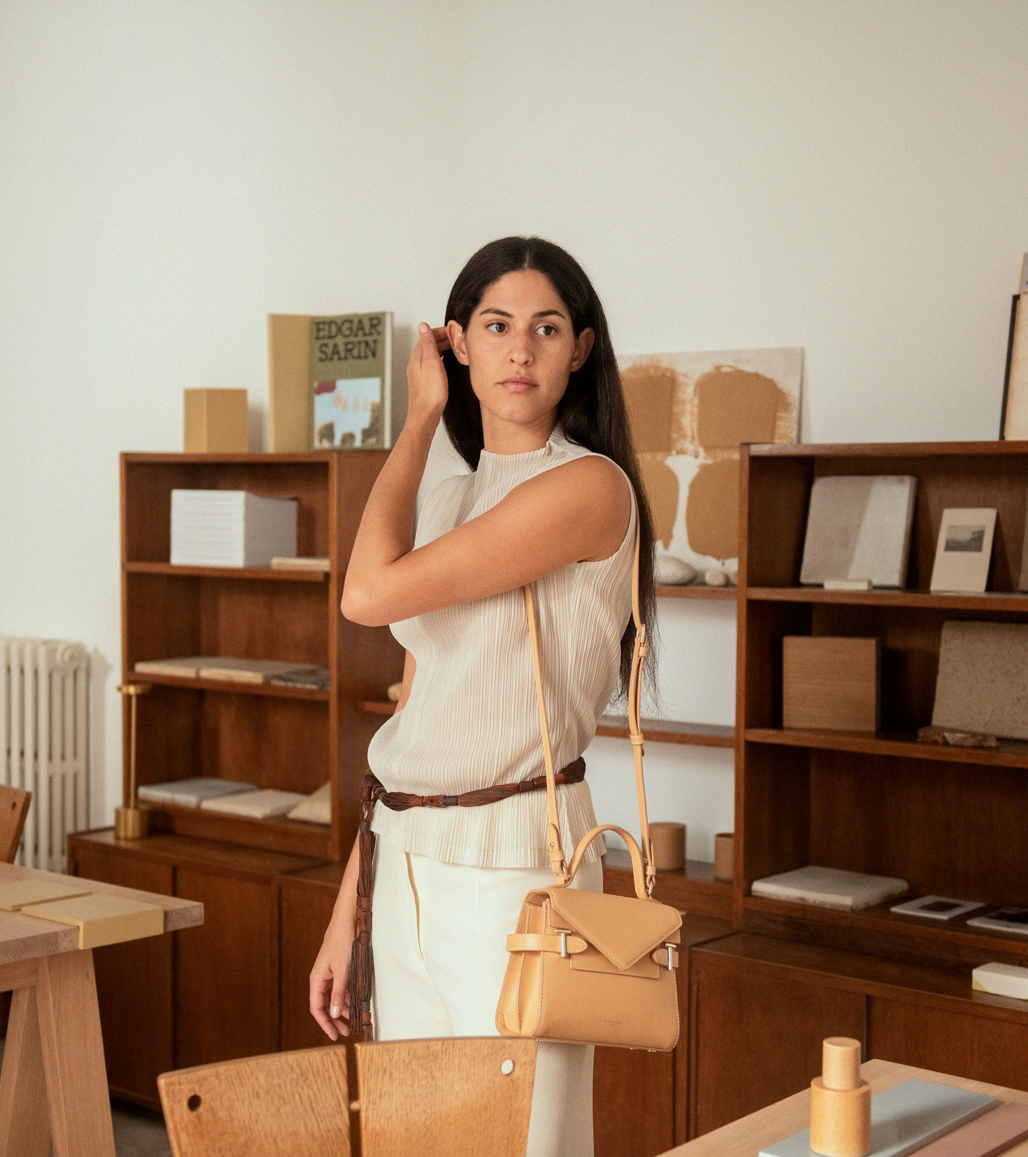 Dimensions : petit format idéal pour l’essentiel. Matière : cuir grainé pleine fleur. Fermeture : double rabat avec bouton pression. Bandoulière ajustable et amovible pour un porté main ou épaule.