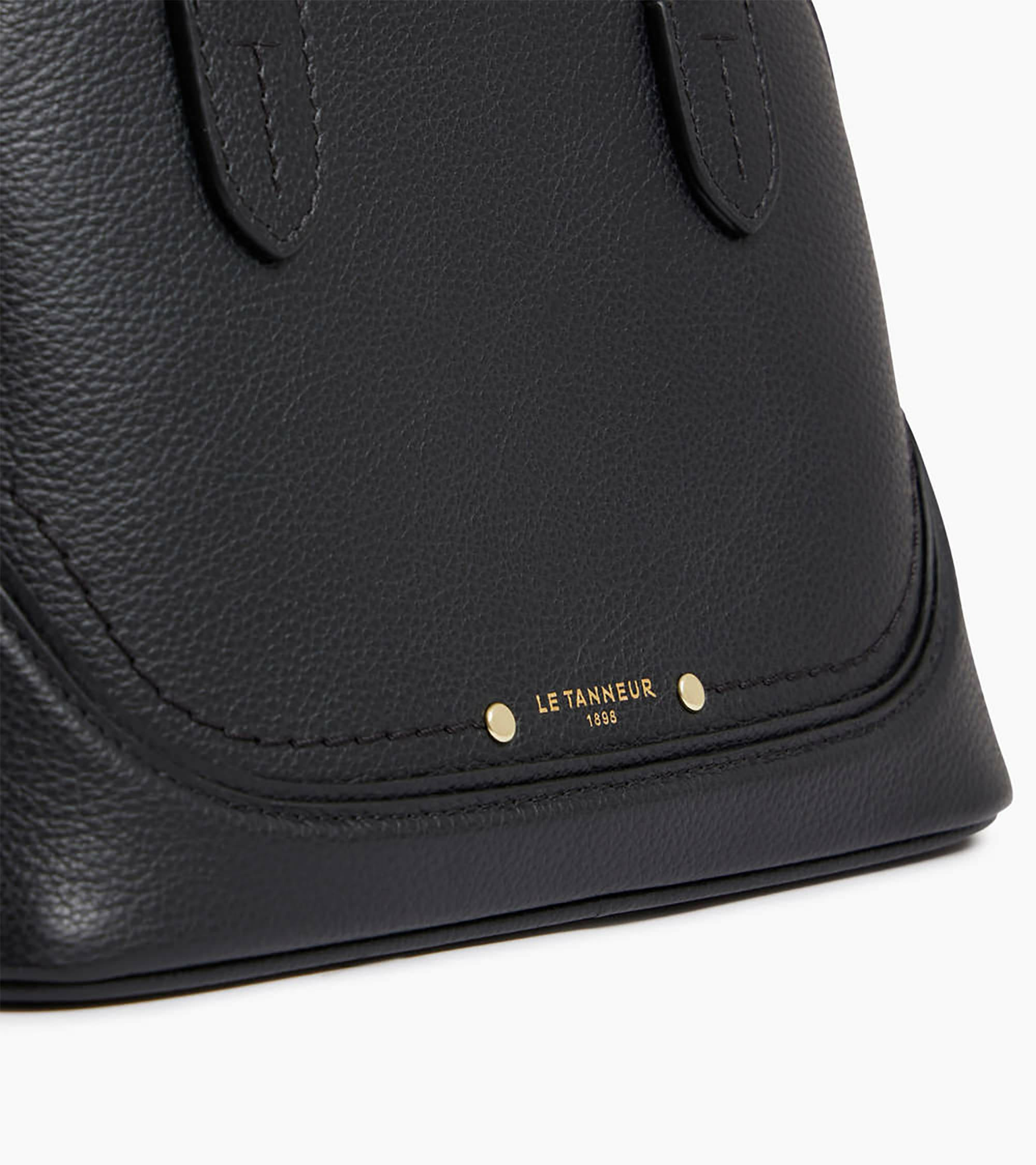 Petit sac à main marqué Le Tanneur, avec renfort de cuir et grande poche zippée. Intérieur jacquard anniversaire 125 ans. Porté main, épaule ou croisé grâce à sa bandoulière ajustable et amovible.Cuir de vachette pleine fleur grainé. Doublure textile jacquard noir.1 poche plate, 1 poche zippée et 1 poche plate. Mousqueton clés. 1 poche plate arrière. Poignée amovible. Bandoulière ajustable et amovible.Accessoires métalliques finition doré clair.Largeur : 21.5 cm x Hauteur : 17 cm x Profondeur : 9.5 cm