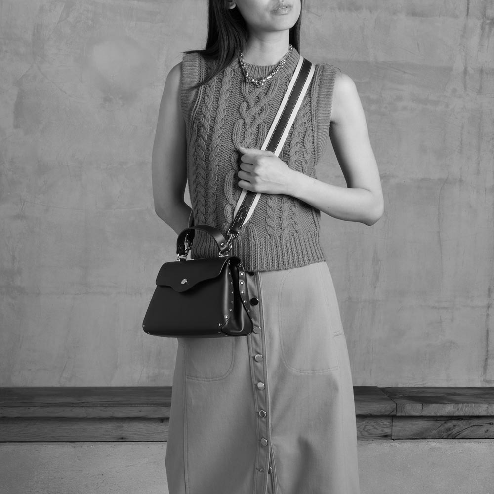 Sac à main petit modèle monté sur rivets, spécialité de la Maison. Marquage Le Tanneur et éléments métalliques finition argent. Porté main, croisé ou épaule grâce à sa bandoulière en coton et cuir ajustable et amovible.Cuir de vachette pleine fleur lisse. Doublure textile.2 poches plates 1 poche zippée. Anse. Bandoulière amovible.Accessoires métalliques finition argent.Largeur : 24 cm x Hauteur : 16 cm x Profondeur : 10 cm