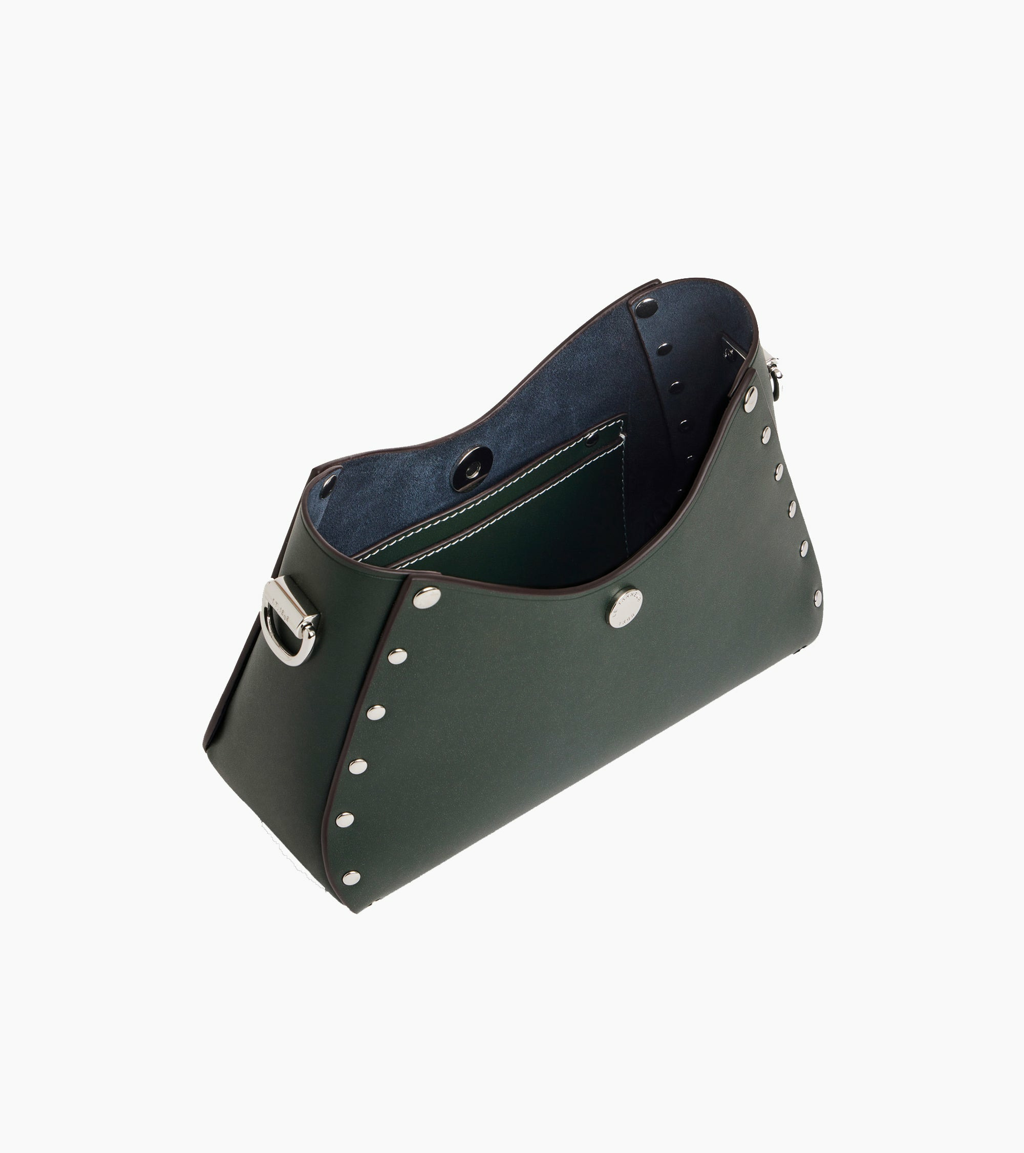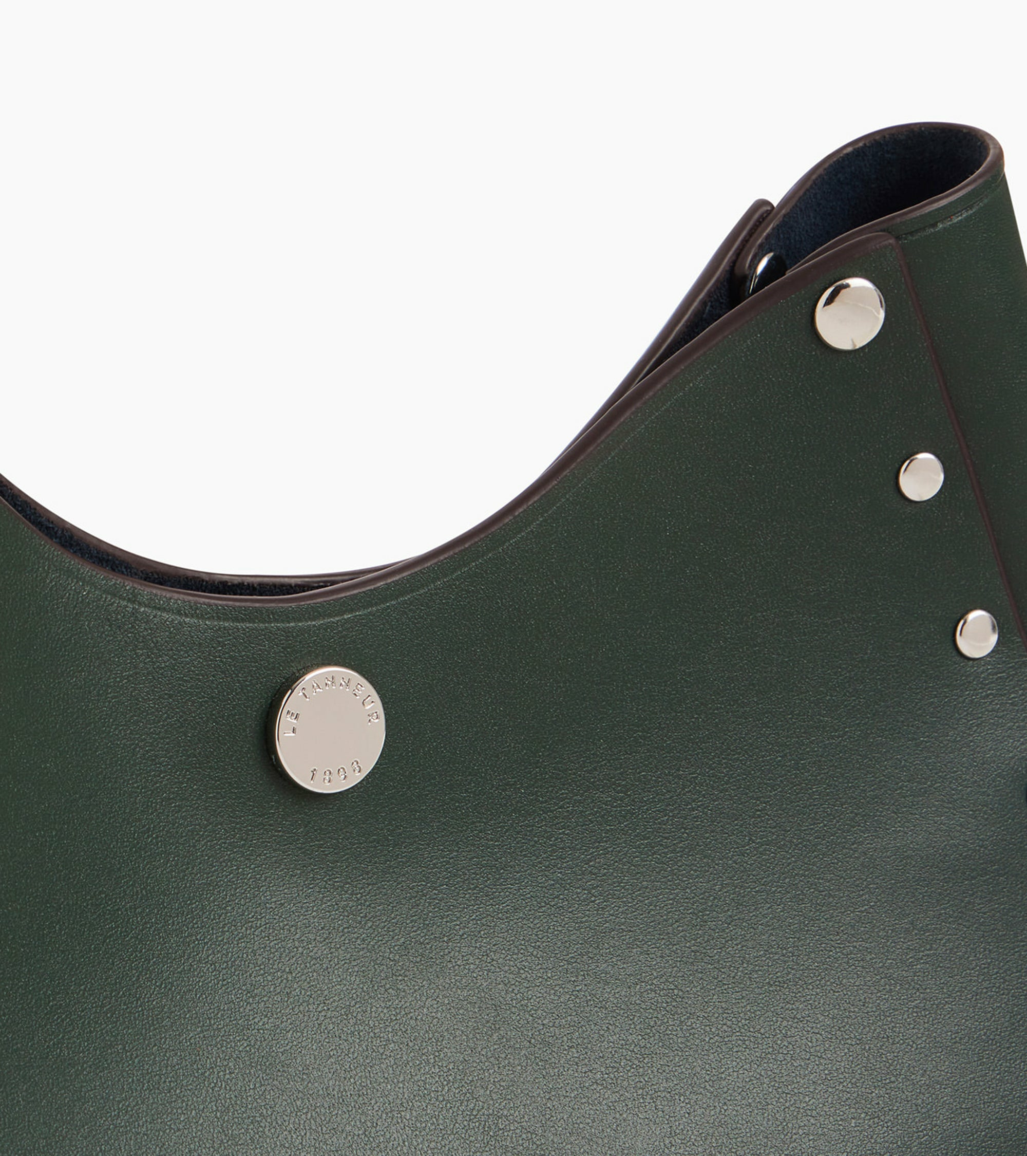 Petit sac baguette monté sur rivets, spécialité de la maison. Éléments métalliques et marquage Le Tanneur finition argent. Porté croisé ou épaule grâce à sa bandoulière cuir amovible et ajustable, ou sa bandoulière courte en sangle et cuir.Cuir de vachette pleine fleur lisse. Doublure en refente de cuir de vachette1 poche plate. 1 bandoulière courte sangle amovible et 1 bandoulière en cuir longue, ajustable et amovible.Accessoires métalliques finition argent.Largeur : 21 cm x Hauteur : 11 cm x Profondeur : 8.5 cm