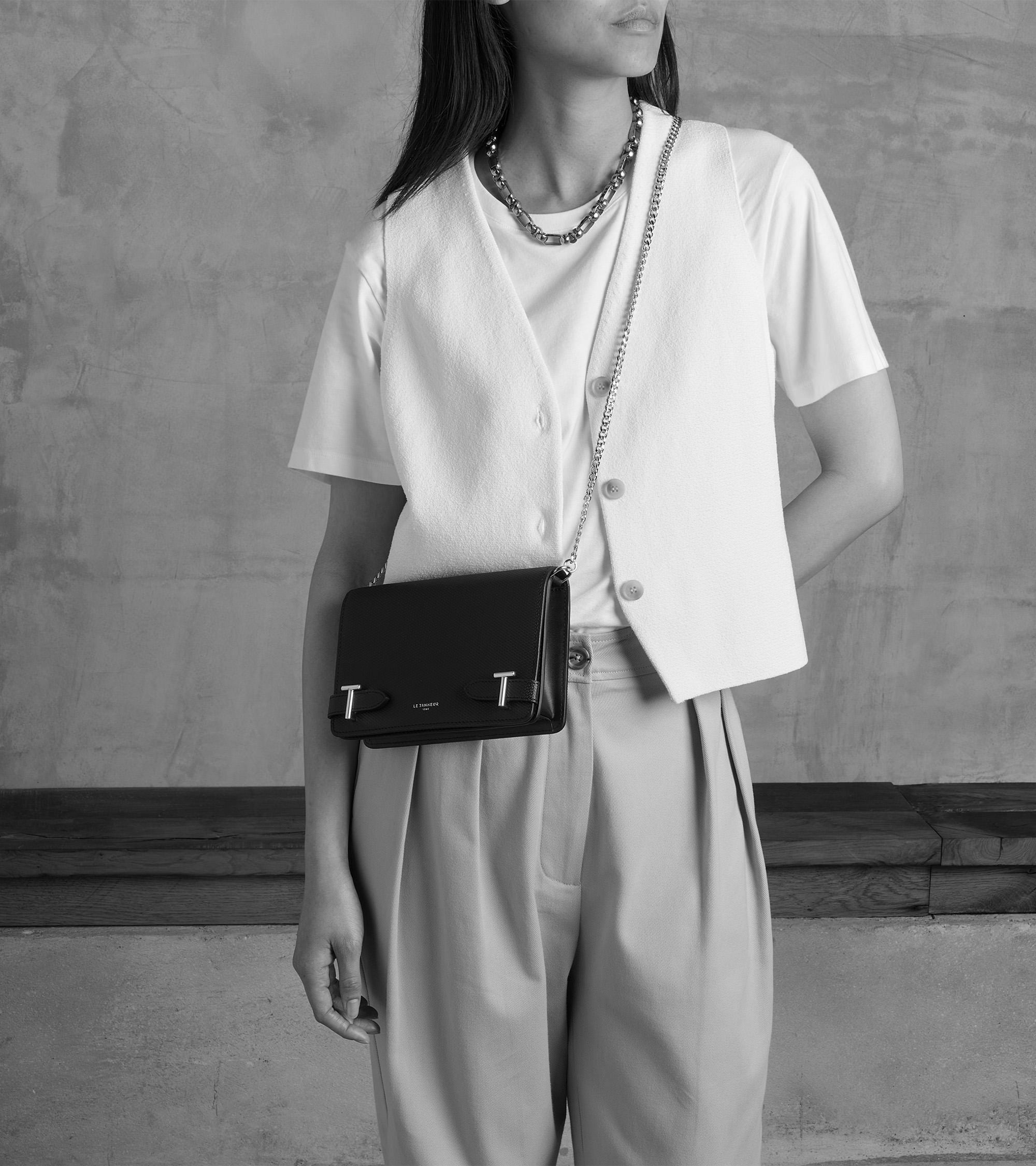 Ce petit sac bandoulière en cuir signature T de la Maison est ornée des fermoirs caractéristiques Le Tanneur. Portez-la en pochette, à l'épaule ou croisé avec sa bandoulière en chaîne.Cuir de vachette grain t pleine fleur. Doublure polyester Le Bleu.1 poche plate, 1 poche zippée et 6 compartiments cartes.Accessoires métalliques finition doré clair.Largeur : 20.5 cm x Hauteur : 13.5 cm x Profondeur : 4 cm