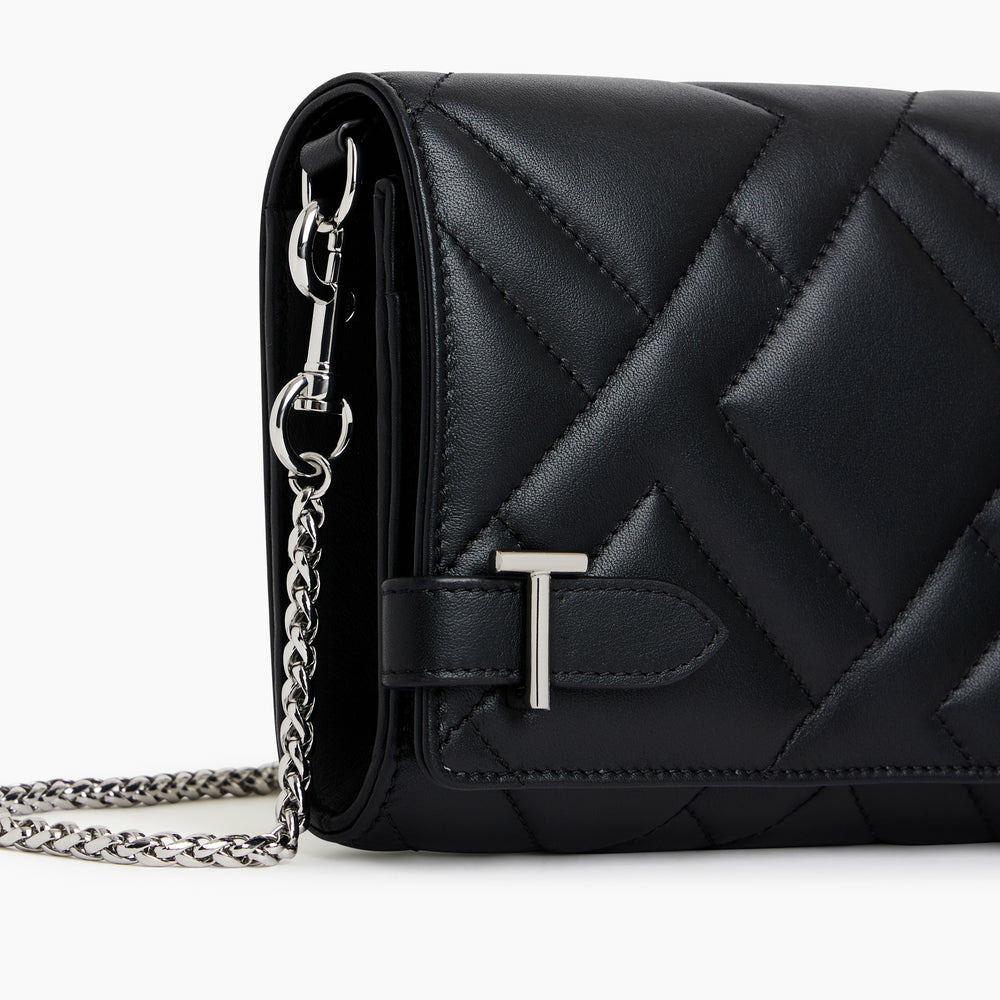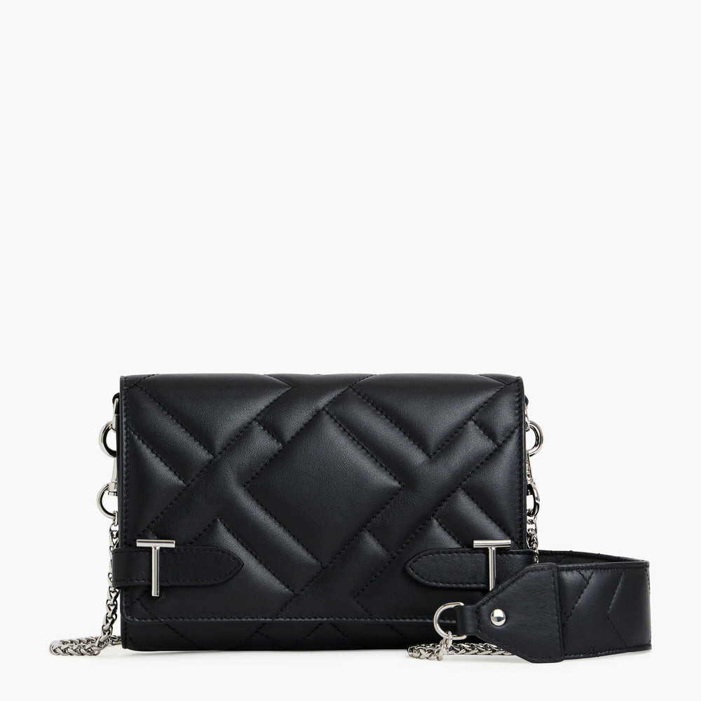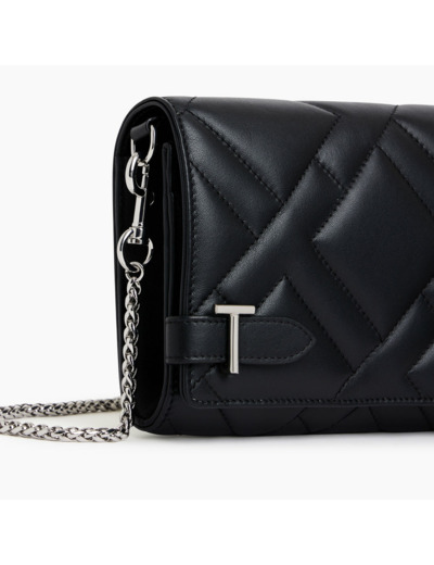 Pochette à rabat avec fermoirs T signature et bandoulière chaîne et cuir amovible. Éléments métalliques et marquage Le Tanneur finition argent. Dispose d'une protection RFID.Cuir de vachette pleine fleur lisse. Doublure textile jacquard noir.1 poche plate avant et 1 poche zippée. 1 soufflet, 14 compartiments cartes et 1 poche plate dos. 1 poche plate arrière. Bandoulière amovible.Accessoires métalliques finition argent.Largeur : 19 cm x Hauteur : 12 cm x Profondeur : 4 cm
