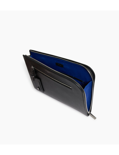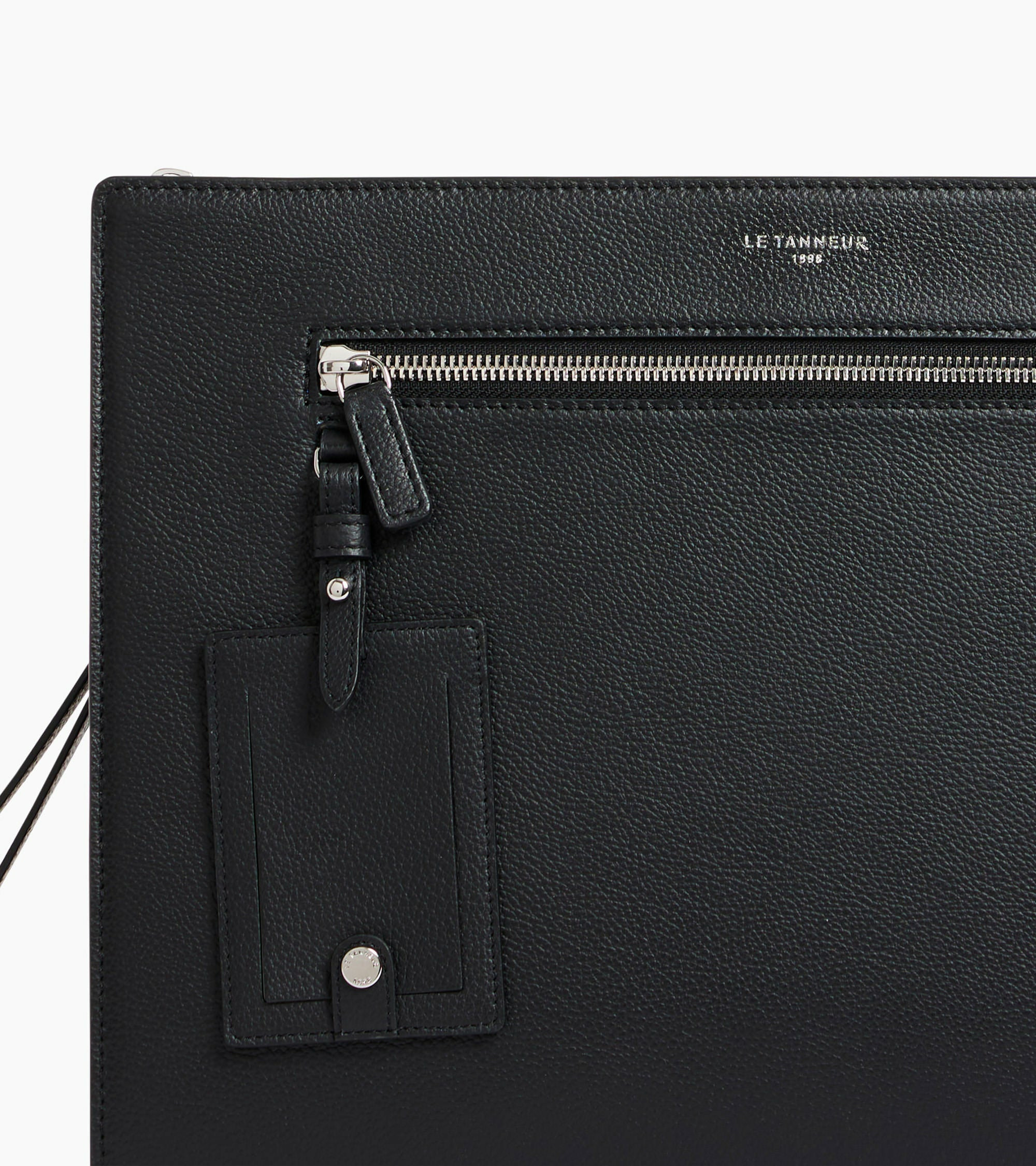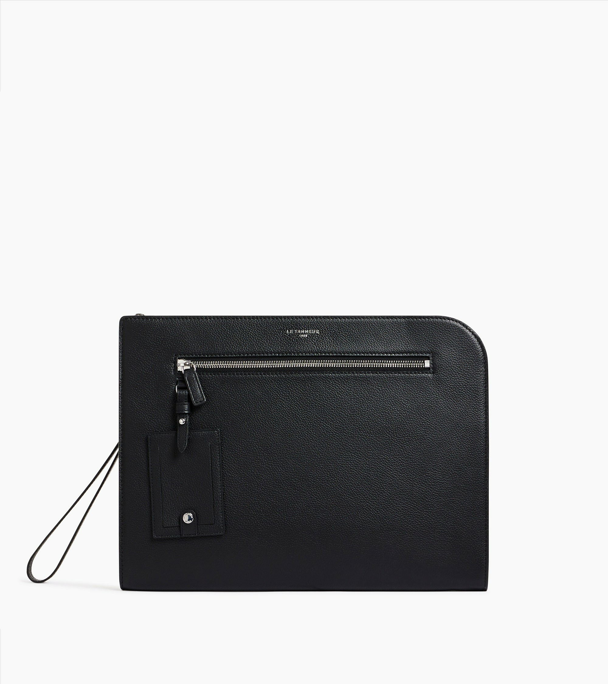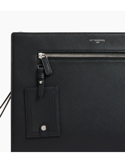 Pochette A4 finition argent avec charms amovible et marquage Le Tanneur en lettres métal argentées.Cuir de vachette pleine fleur grainé. Doublure polyester Le Bleu.2 poches plates. Côtés doublés en mousse. 1 poche zippée avant. Dragonne amovibleAccessoires métalliques finition argent.Largeur : 33.5 cm x Hauteur : 24 cm x Profondeur : 3 cm
