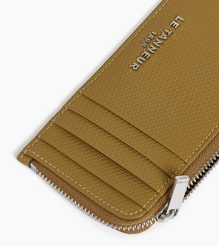 Dimensions : 12 x 9 cm. Matière : cuir pleine fleur signature Le Tanneur. Fermeture : zip métallique robuste. Compartiments : plusieurs fentes pour cartes, un espace pour billets et une poche zippée pour pièces.