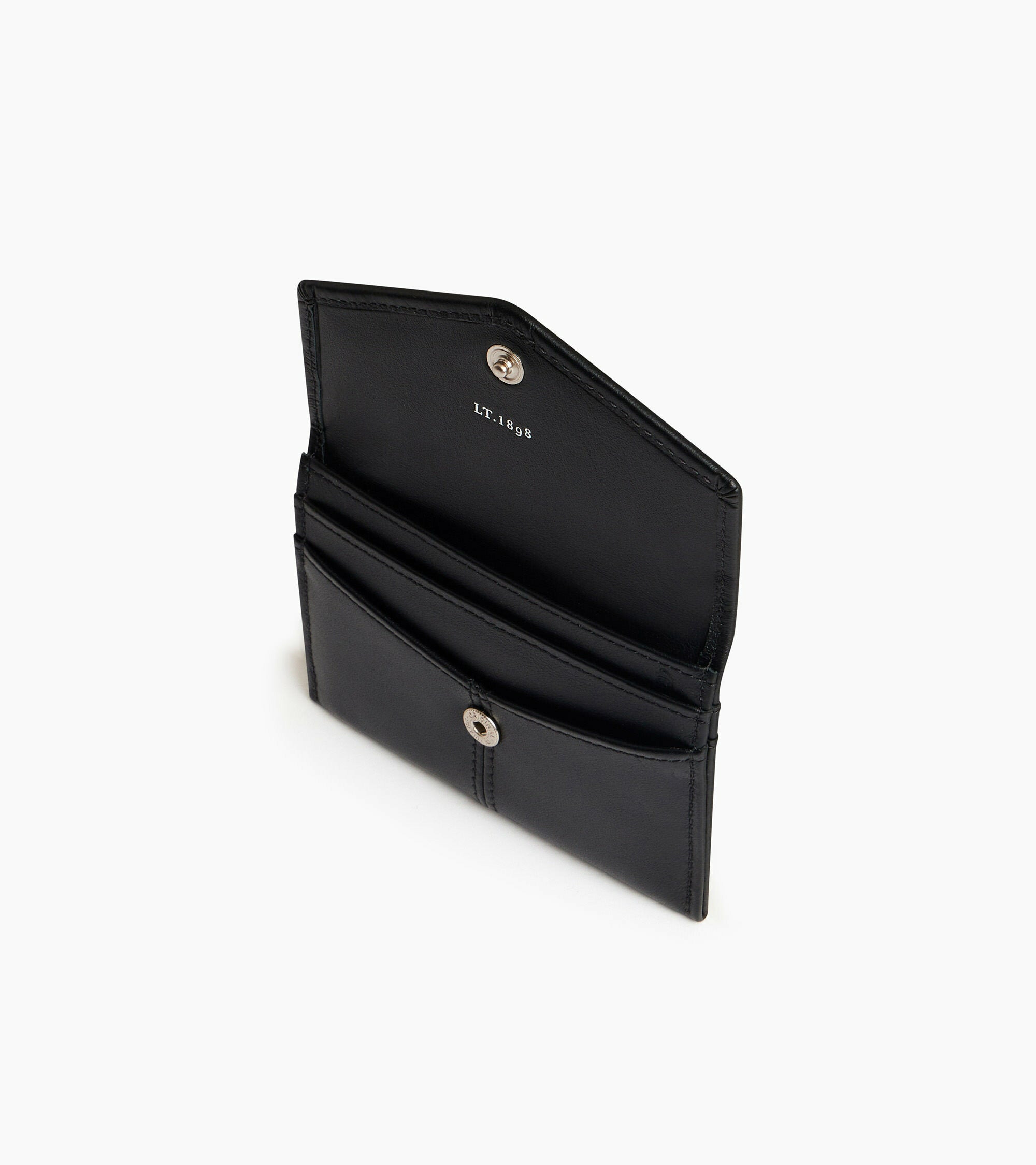 Porte-cartes avec fermeture pression et marquage Le Tanneur finition argent.Cuir de vachette pleine fleur lisse. Doublure textile Le Bleu.2 poches plates et 3 compartiments cartes.Accessoires métalliques finition argent.Largeur : 10 cm x Hauteur : 7 cm