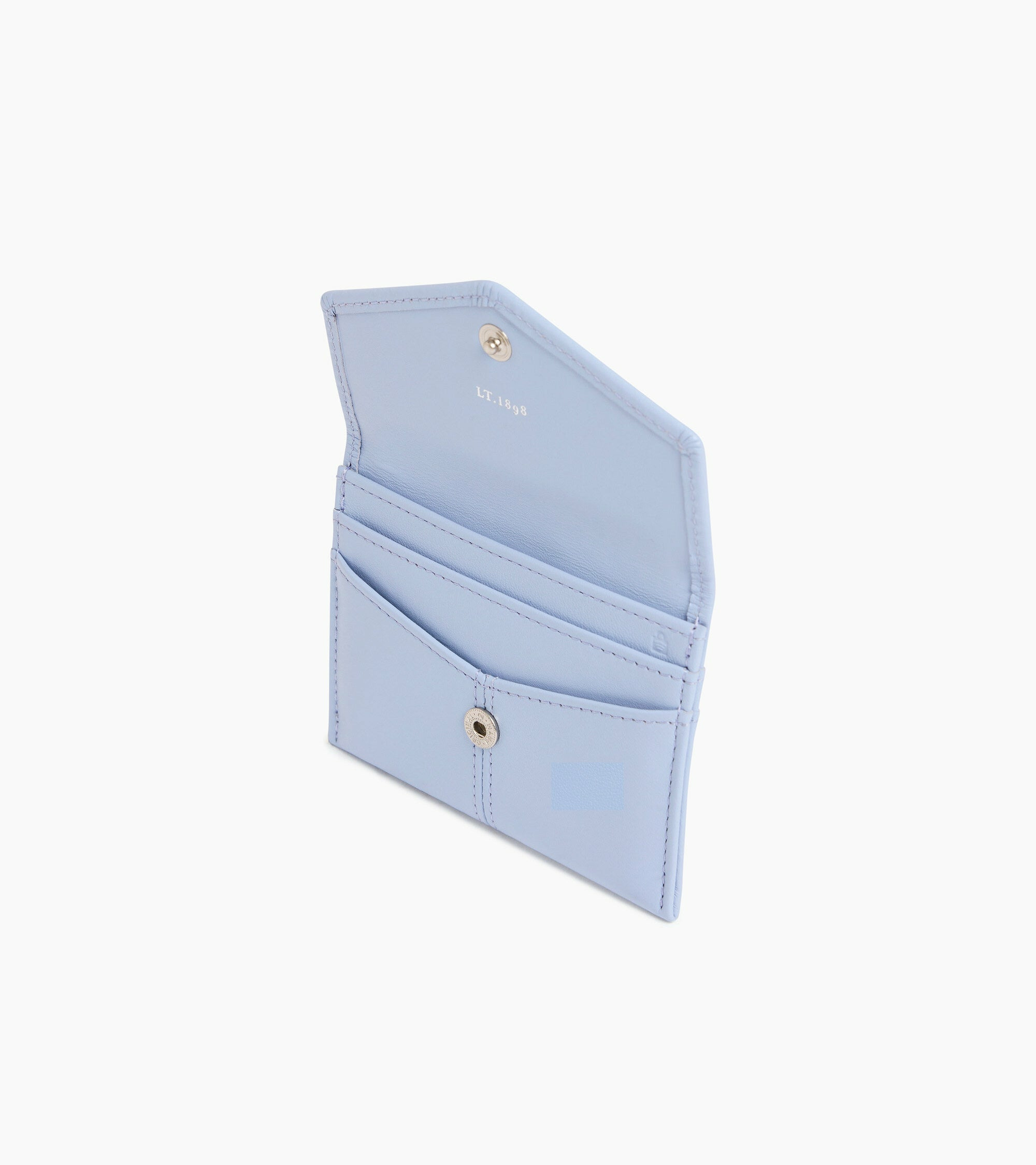 Porte-cartes avec fermeture pression et marquage Le Tanneur finition argent.Cuir de vachette pleine fleur lisse. Doublure textile Le Bleu.2 poches plates et 3 compartiments cartes.Accessoires métalliques finition argent.Largeur : 10 cm x Hauteur : 7 cm