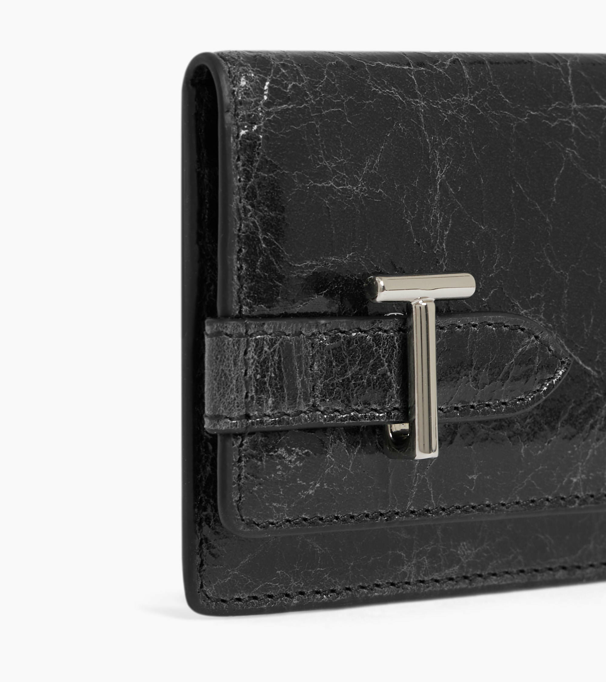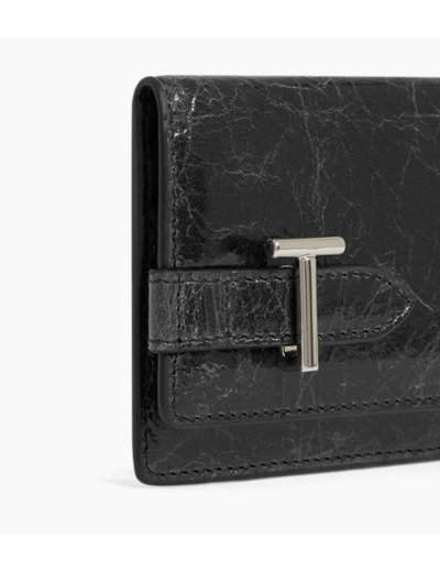 Porte-cartes à rabat avec fermoir T signature finition argent. Sécurité anti-RFID.Cuir de vachette pleine fleur froissé. Doublure Jacquard Anniversaire.3 compartiments cartes. 2 compartiments cartes dos.Accessoires métalliques finition argent.Largeur : 10 cm x Hauteur : 7.5 cm x Profondeur : 1 cm