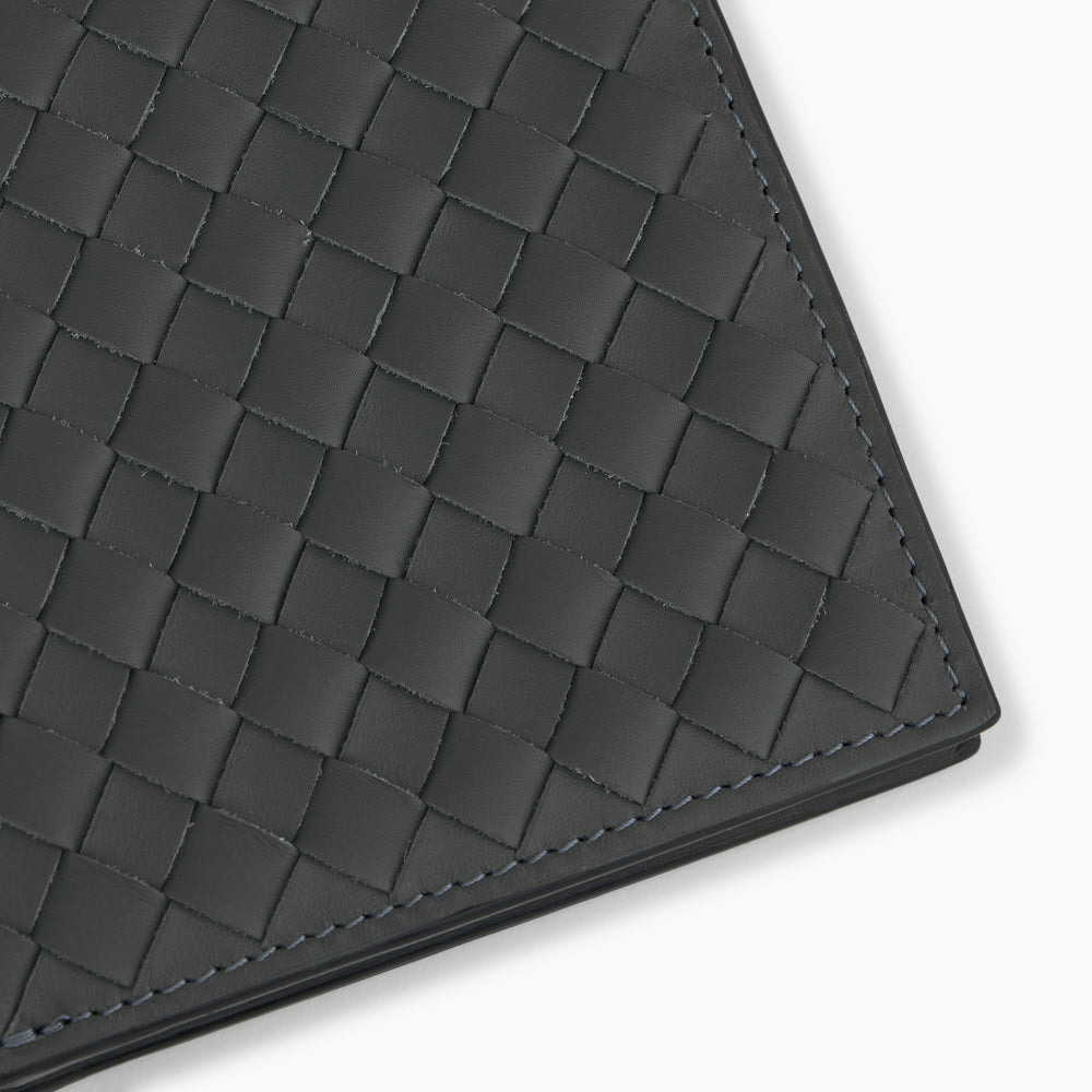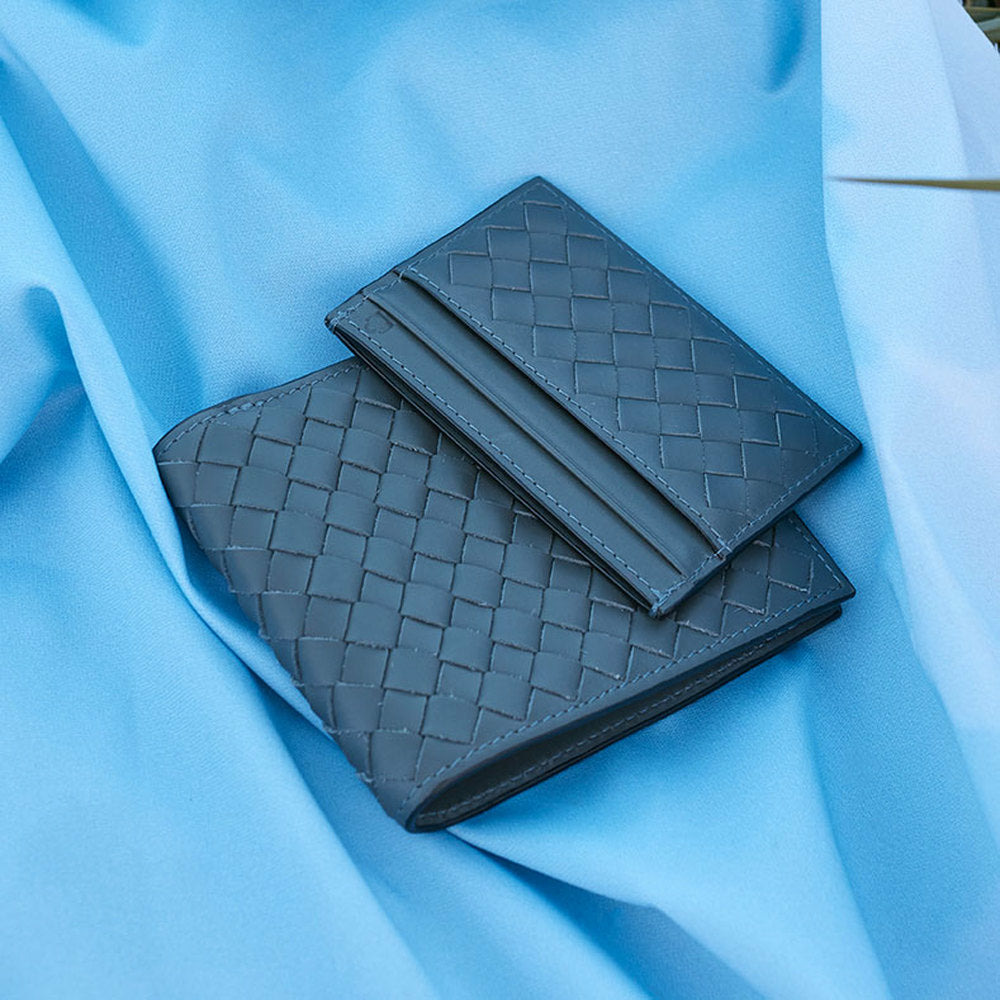 Fabriqué en cuir tressé de qualité supérieure, ce porte-cartes mesure environ 10 cm de largeur sur 7 cm de hauteur. Il comprend plusieurs emplacements pour cartes et une poche centrale pour billets, sans doublure superflue, pour un poids minimal.