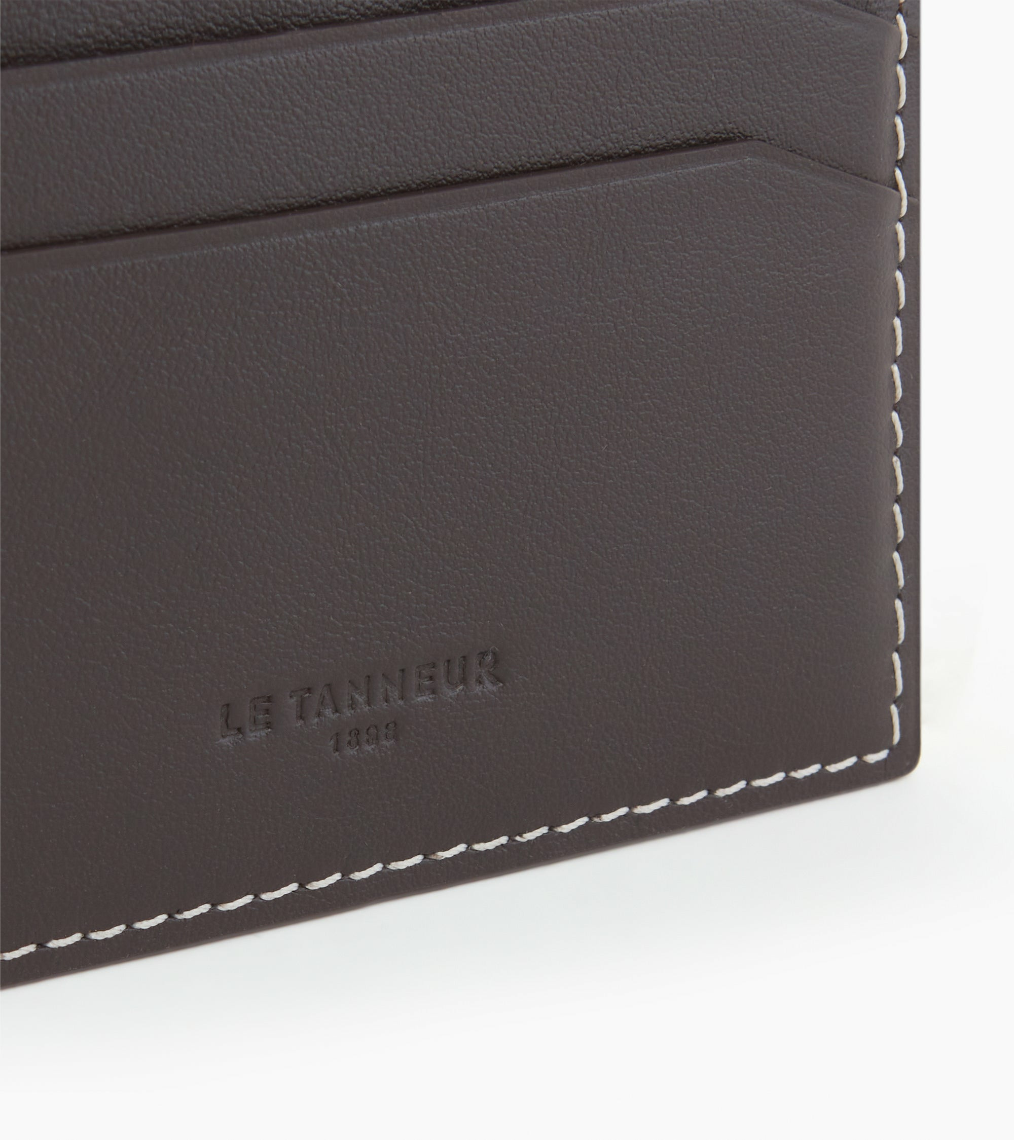 Porte-cartes fabriqué en France à partir de cuir d'origine italienne, avec montage bord franc et piqure contrastée. Marquage Le Tanneur embossé ton.Cuir de vachette pleine fleur lisse. Doublure textile.1 poche plate et 4 compartiments cartes.Accessoires métalliques finition argent.Largeur : 10 cm x Hauteur : 7 cm x Profondeur : 1 cm