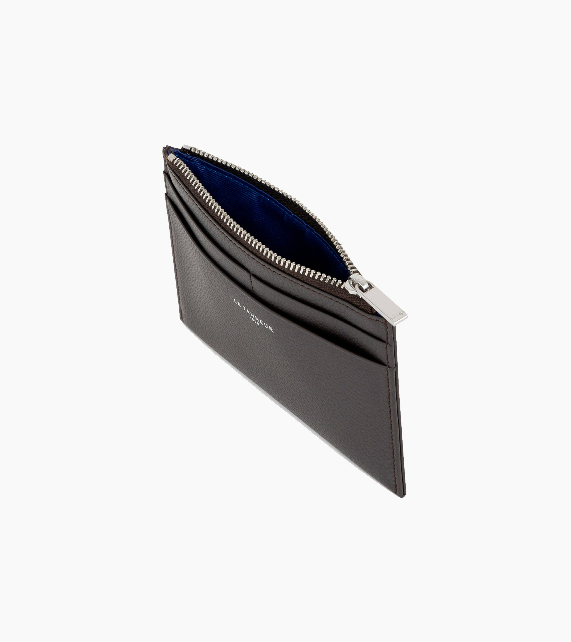 Porte-cartes zippé avec marquage Le Tanneur et zip finition argent. Sécurité anti-RFID.Cuir de vachette pleine fleur grainé. Doublure textile Le Bleu.1 poche zippée. 2 poche plate. 4 compartiments carte.Accessoires métalliques finition argent.Largeur : 13 cm x Hauteur : 10 cm x Profondeur : 1 cm