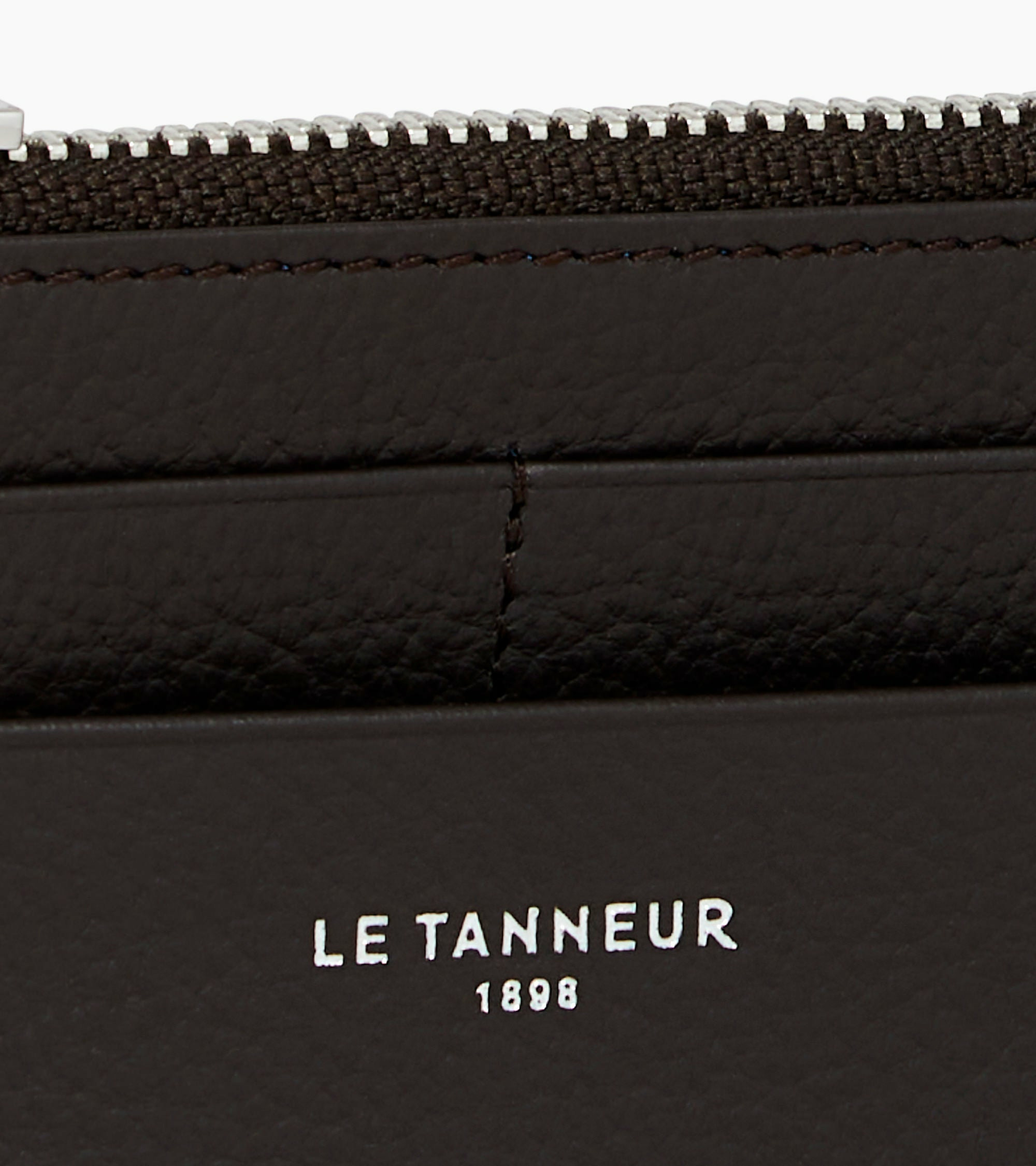 Dimensions compactes, cuir grainé pleine fleur, fermeture zippée métal, compartiments multiples pour cartes et billets, finition soignée signée Le Tanneur.